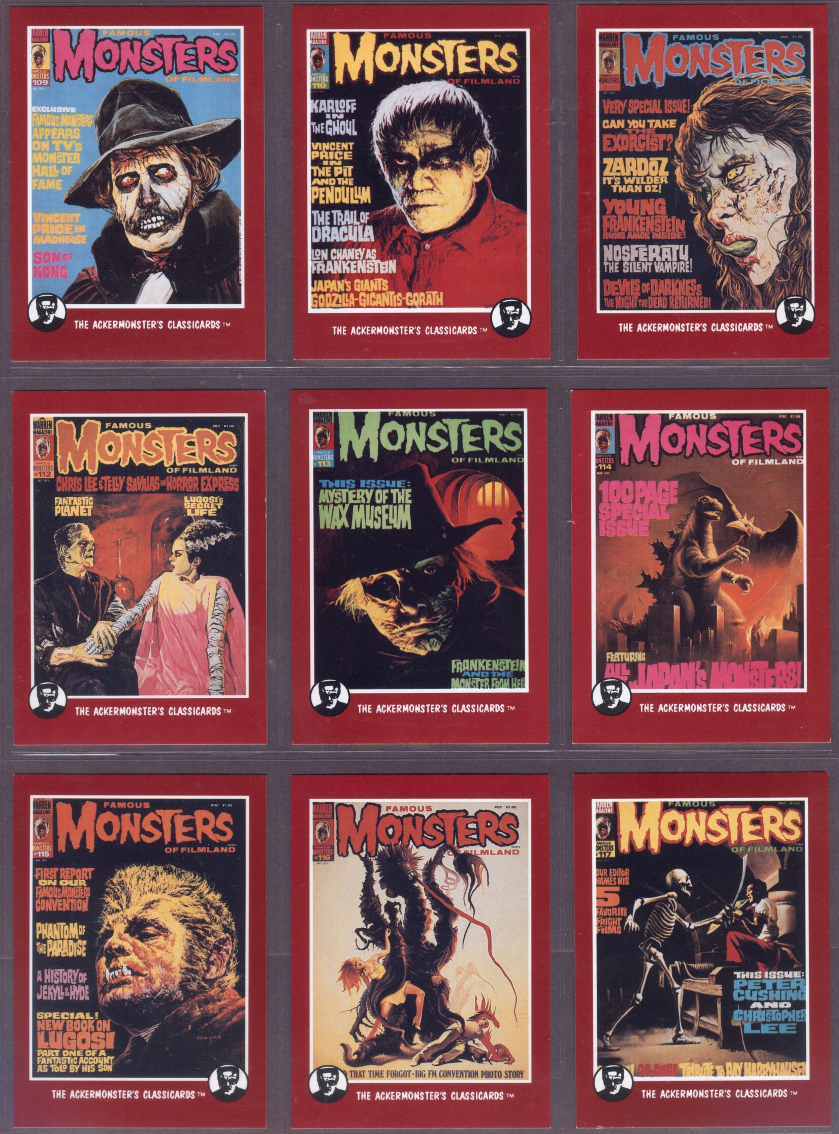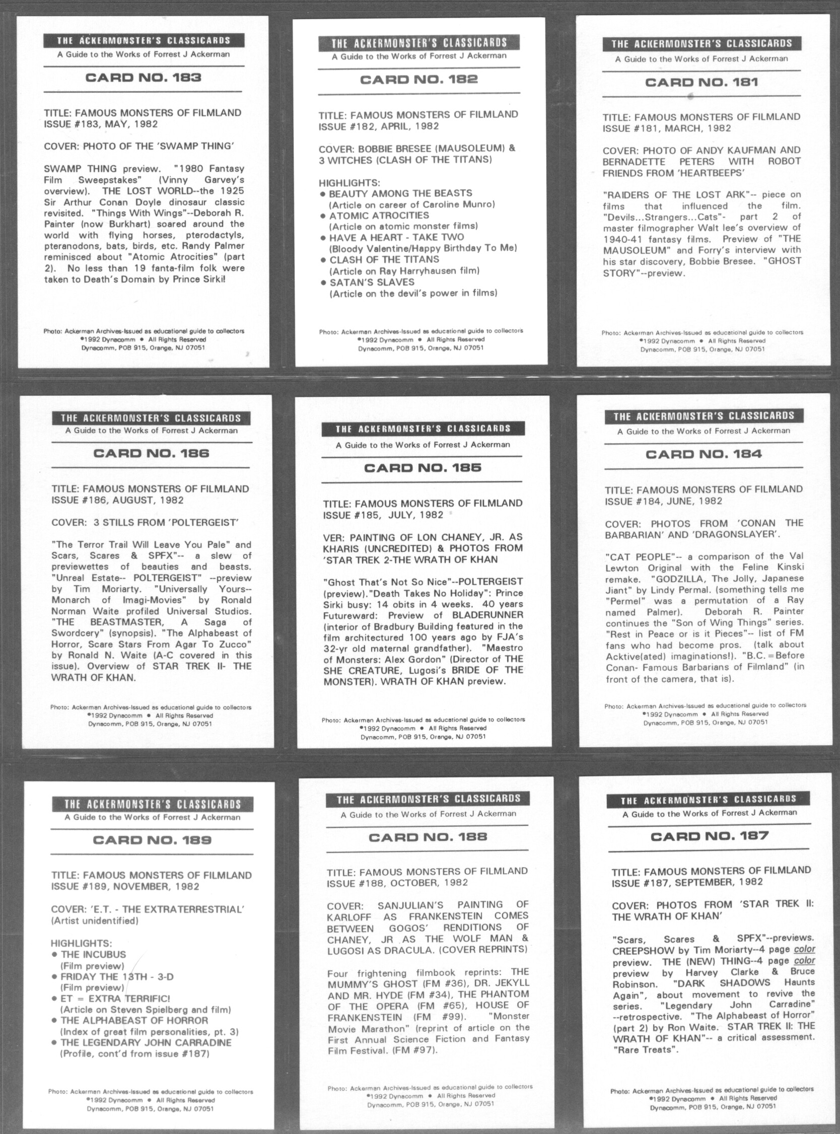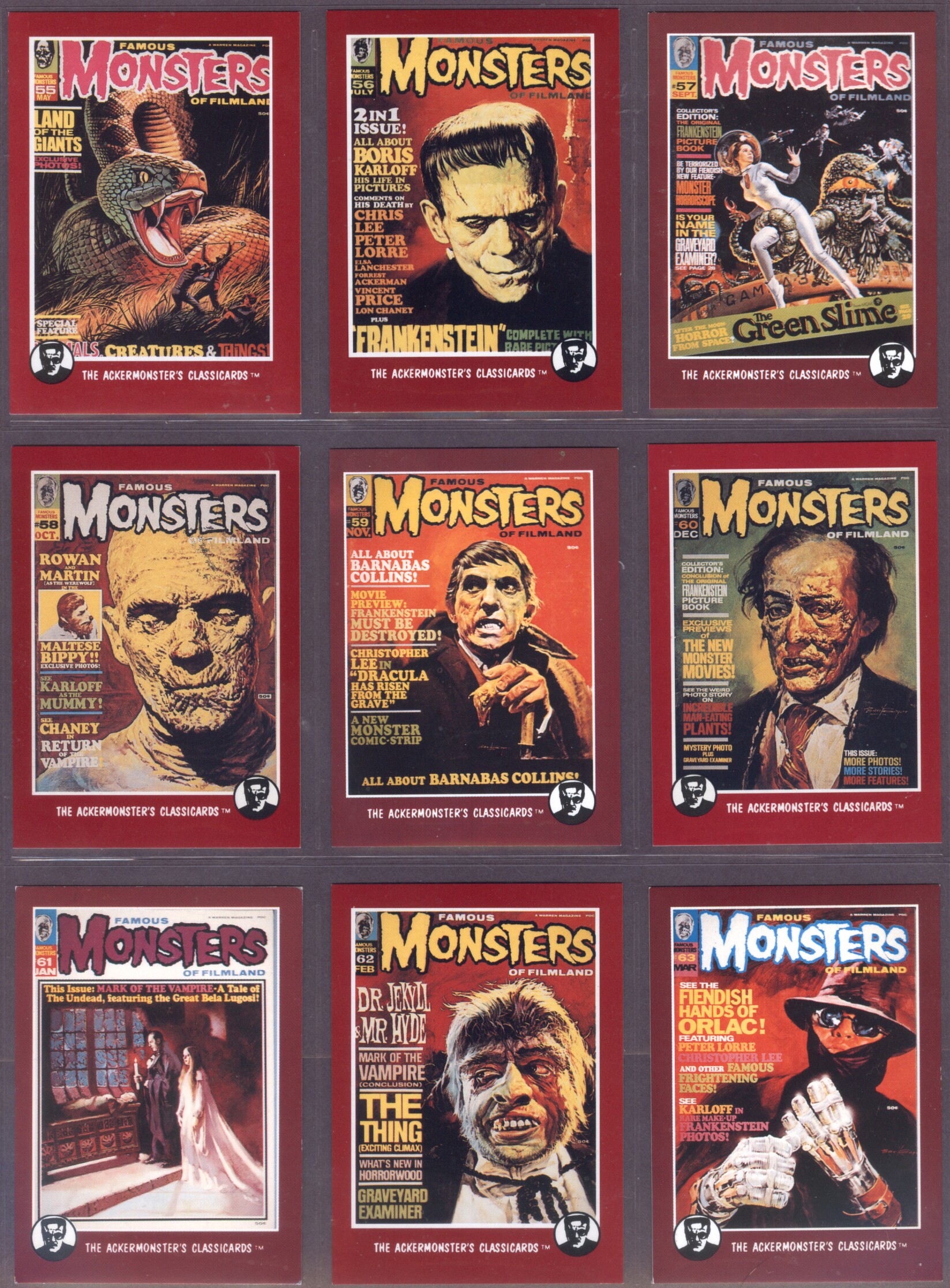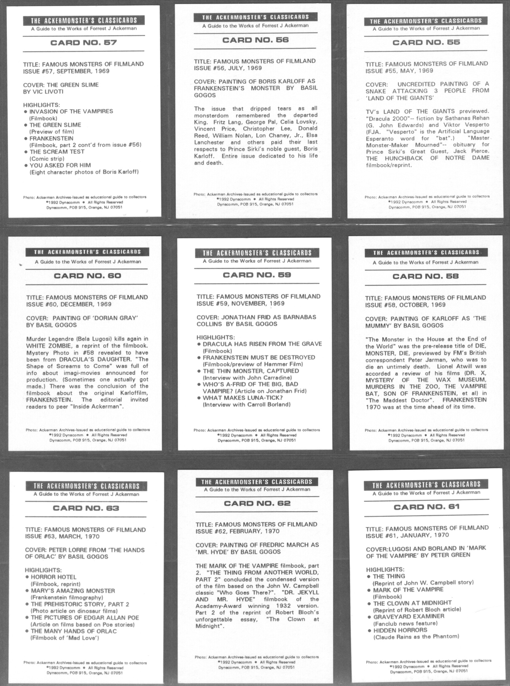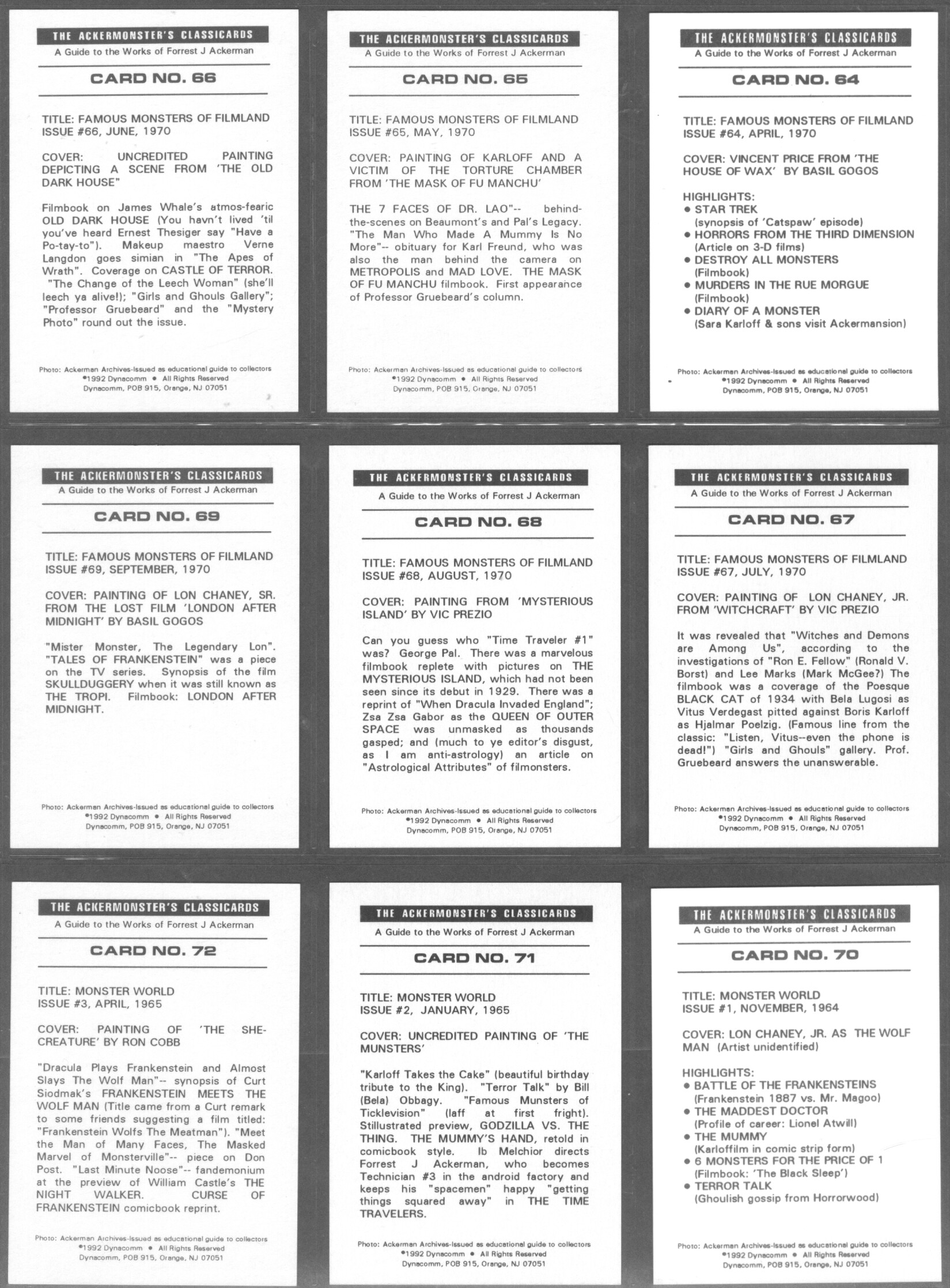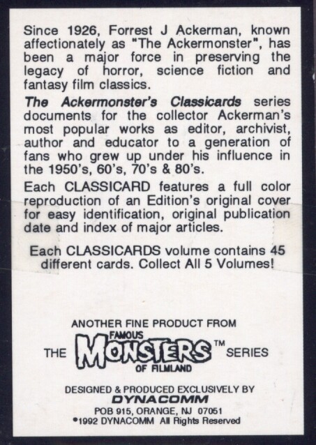 This set of 225 cards were issued in 5 different playing card type boxes. Each pack contained 45 cards in random order so you had to buy all 5 boxes to complete the set. Only sold at Famous Monsters of Filmland conventions, each card contained a picture of a cover of the FMofF magazine.