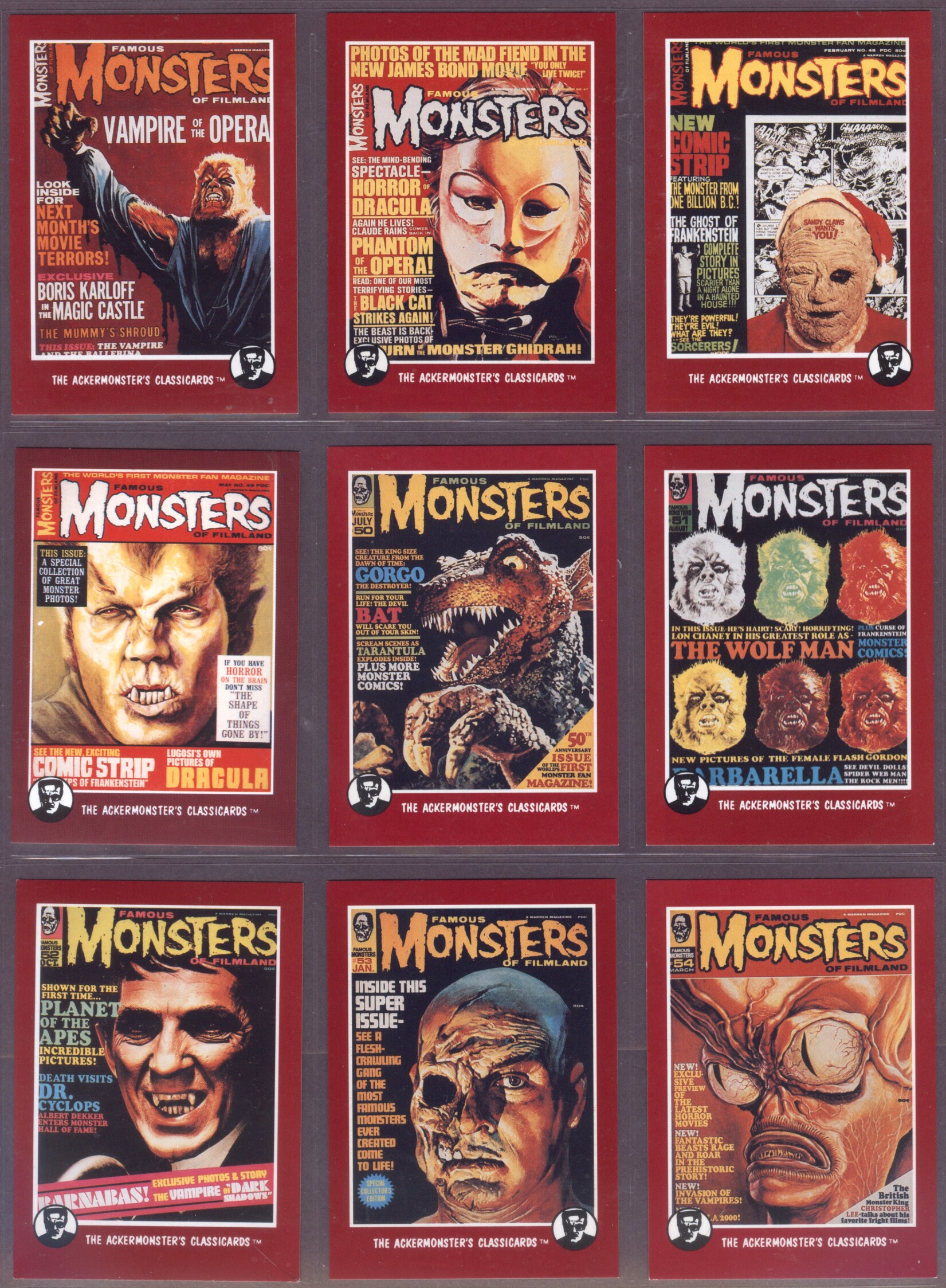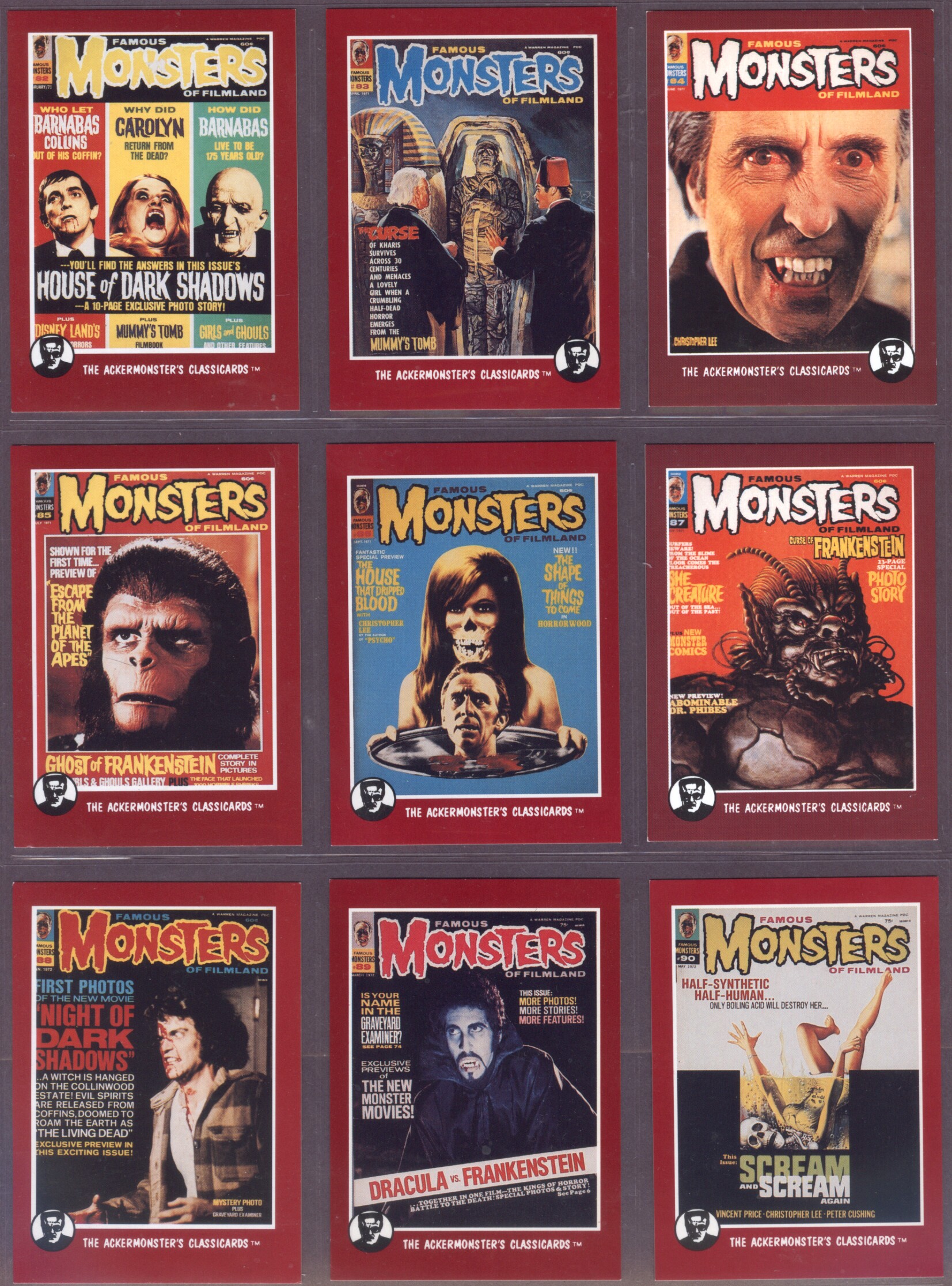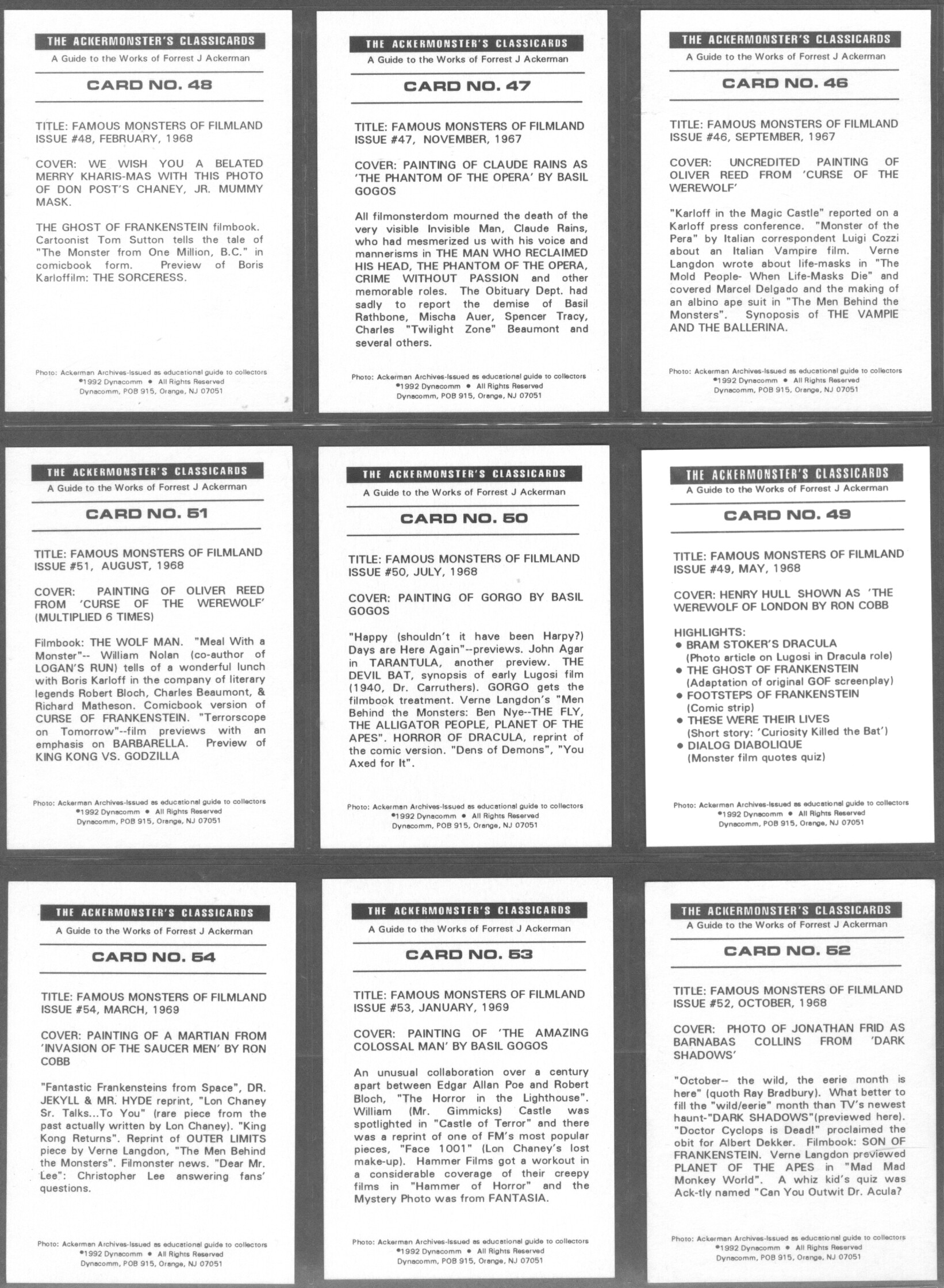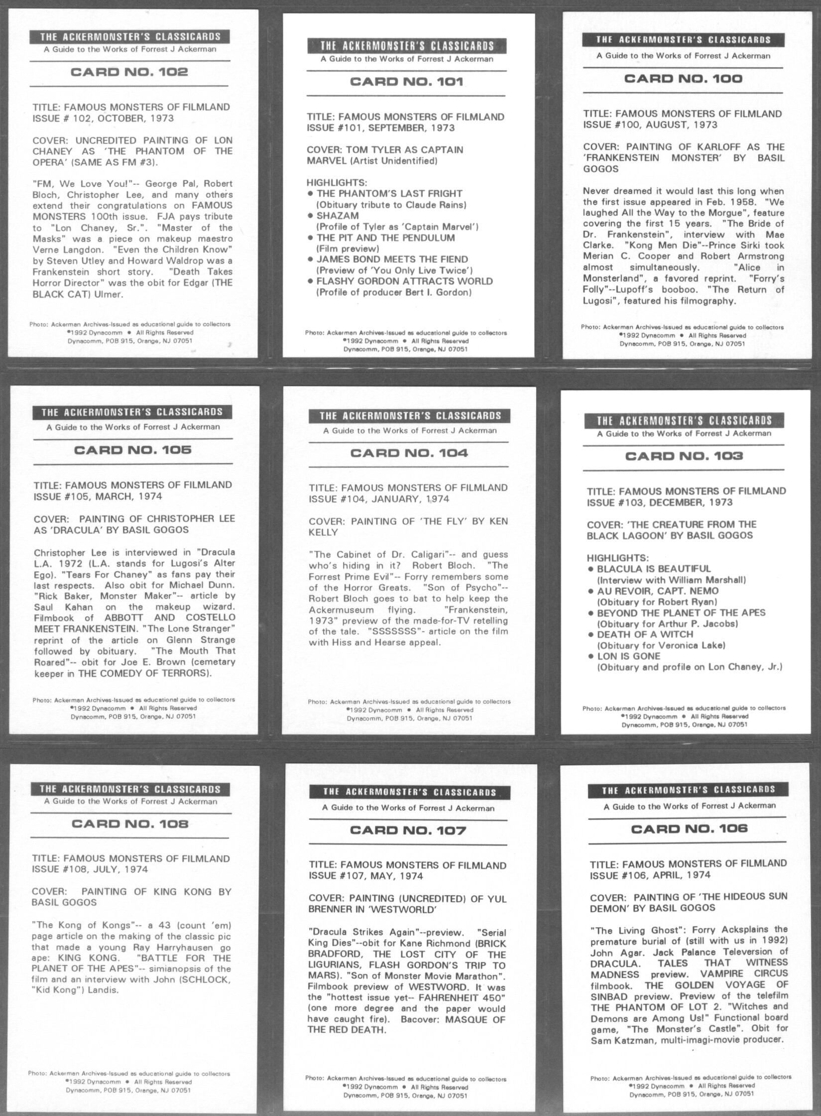 This set of 225 cards were issued in 5 different playing card type boxes. Each pack contained 45 cards in random order so you had to buy all 5 boxes to complete the set. Only sold at Famous Monsters of Filmland conventions, each card contained a picture of a cover of the FMofF magazine.