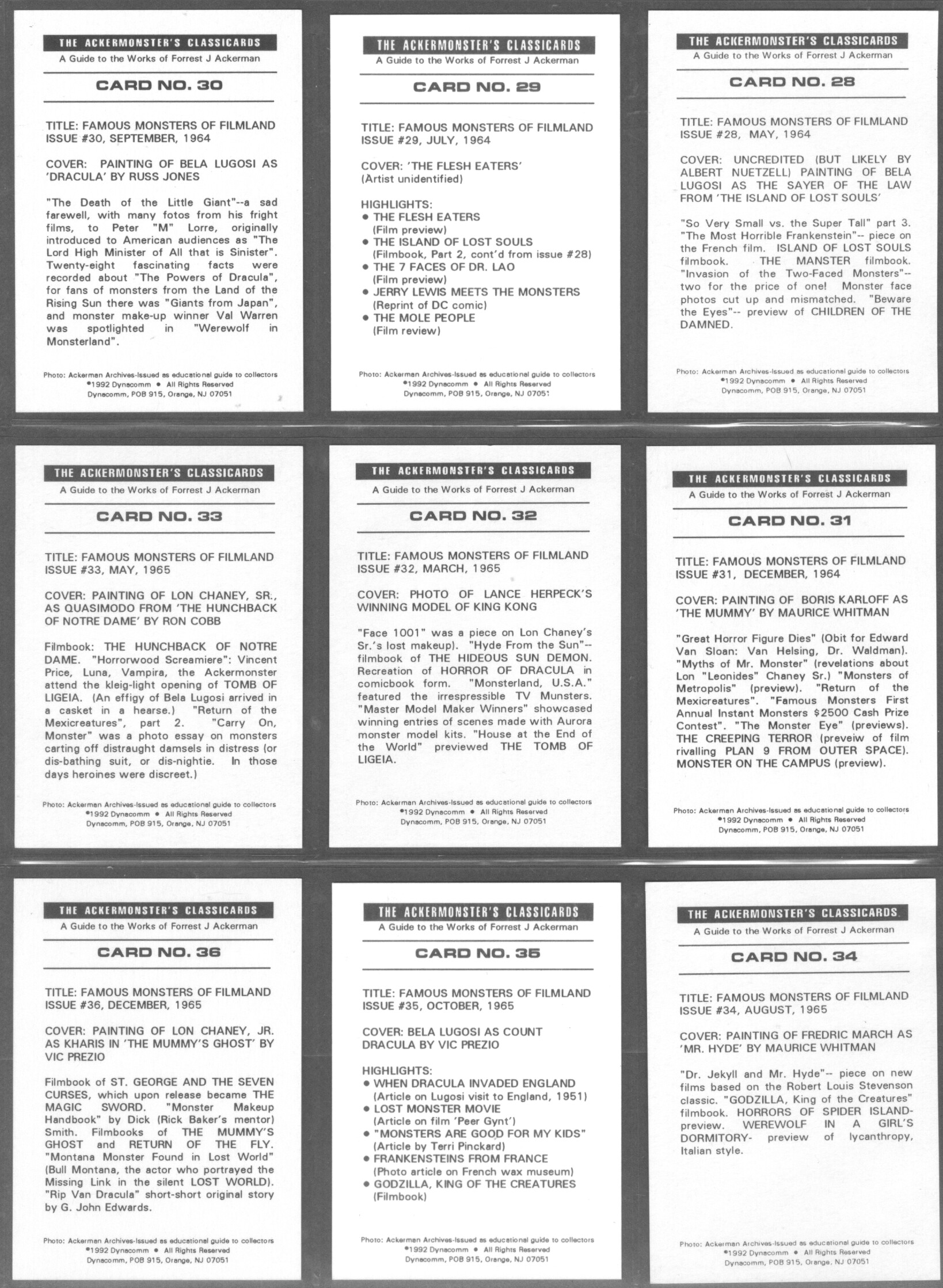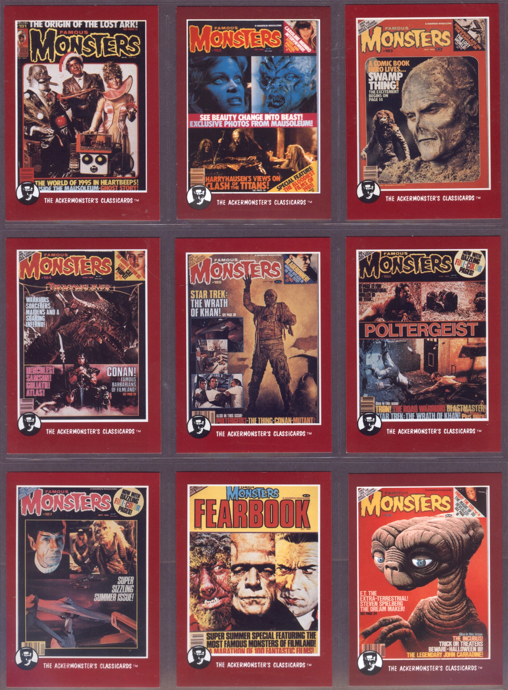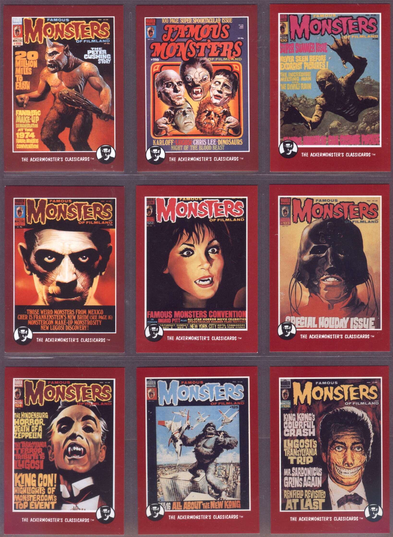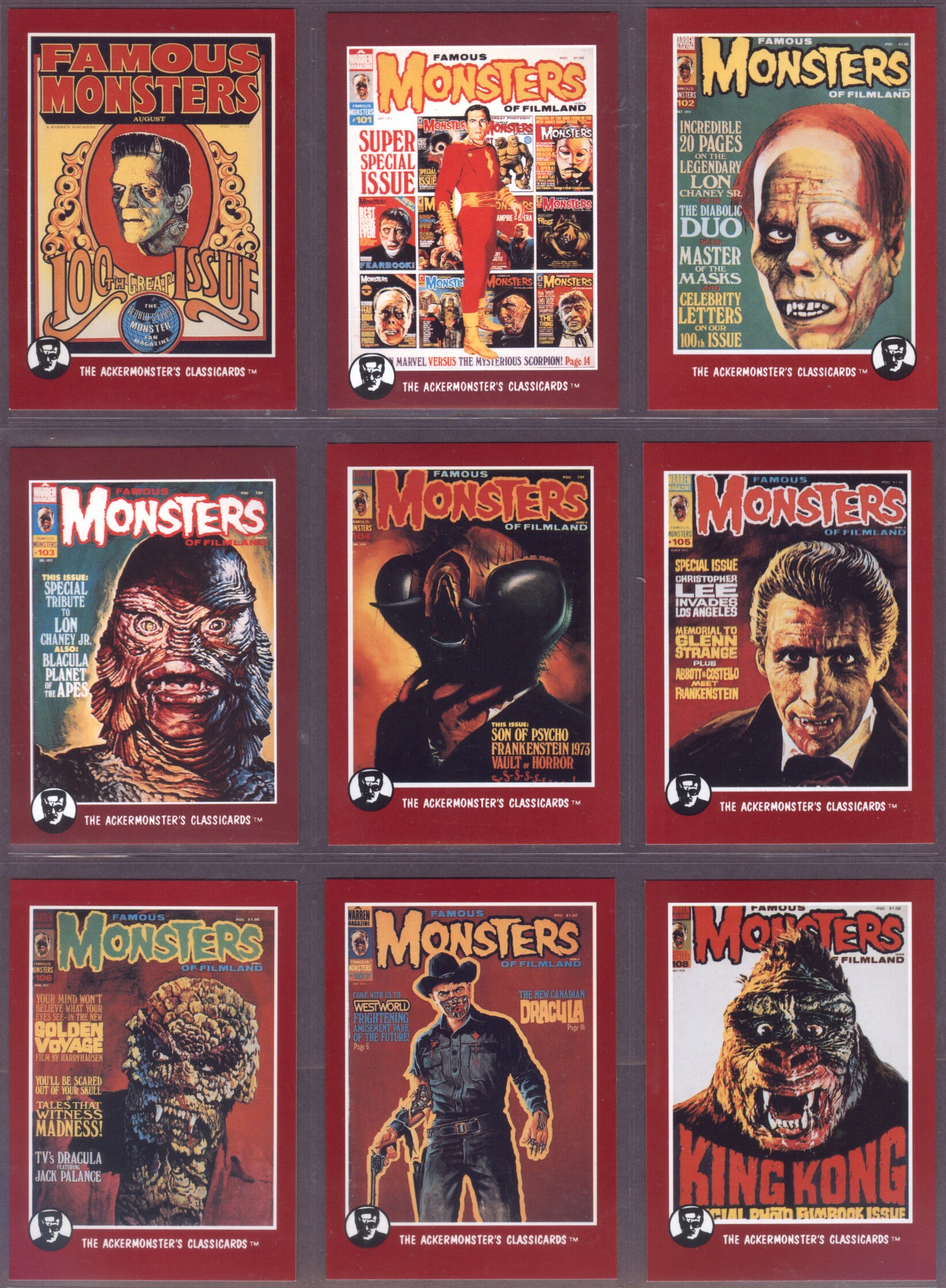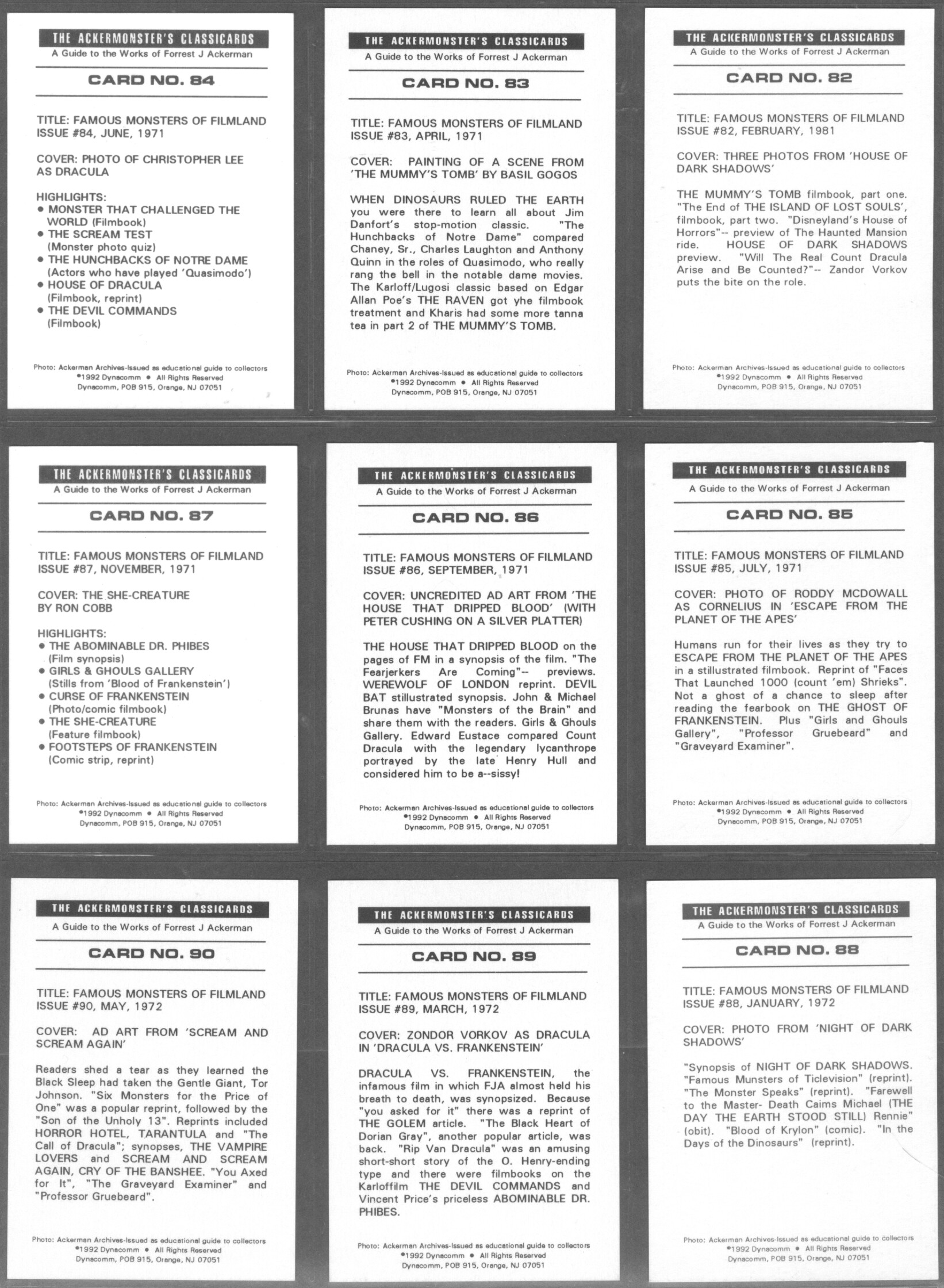 This set of 225 cards were issued in 5 different playing card type boxes. Each pack contained 45 cards in random order so you had to buy all 5 boxes to complete the set. Only sold at Famous Monsters of Filmland conventions, each card contained a picture of a cover of the FMofF magazine.
