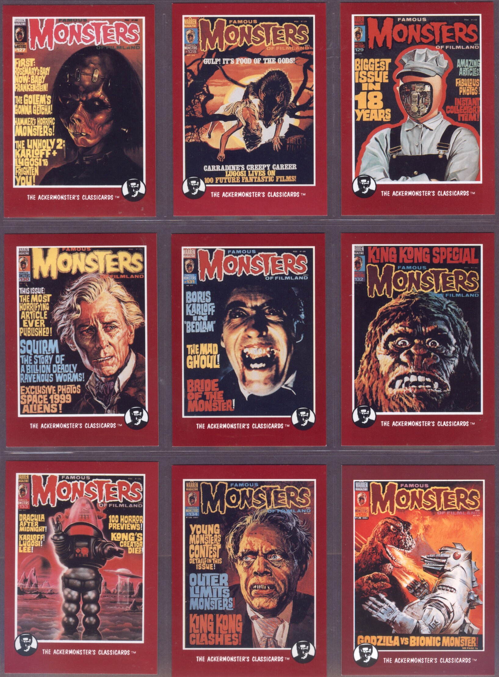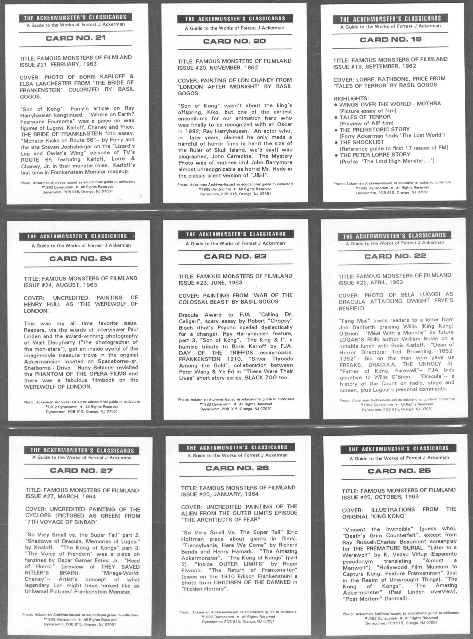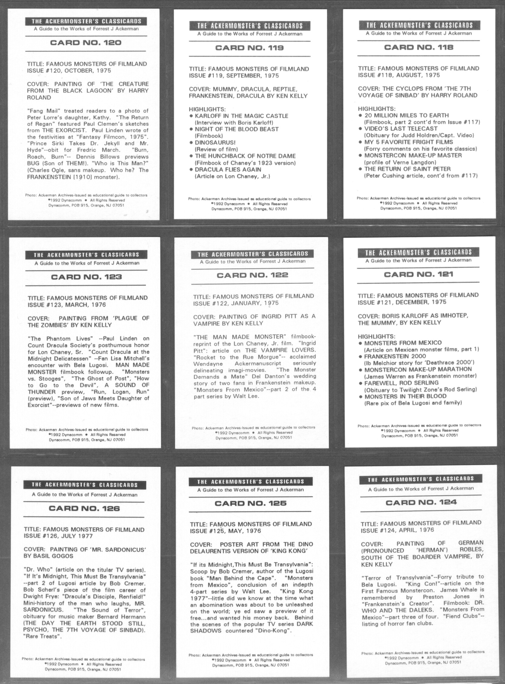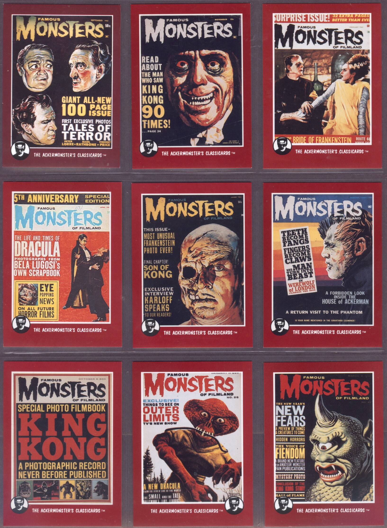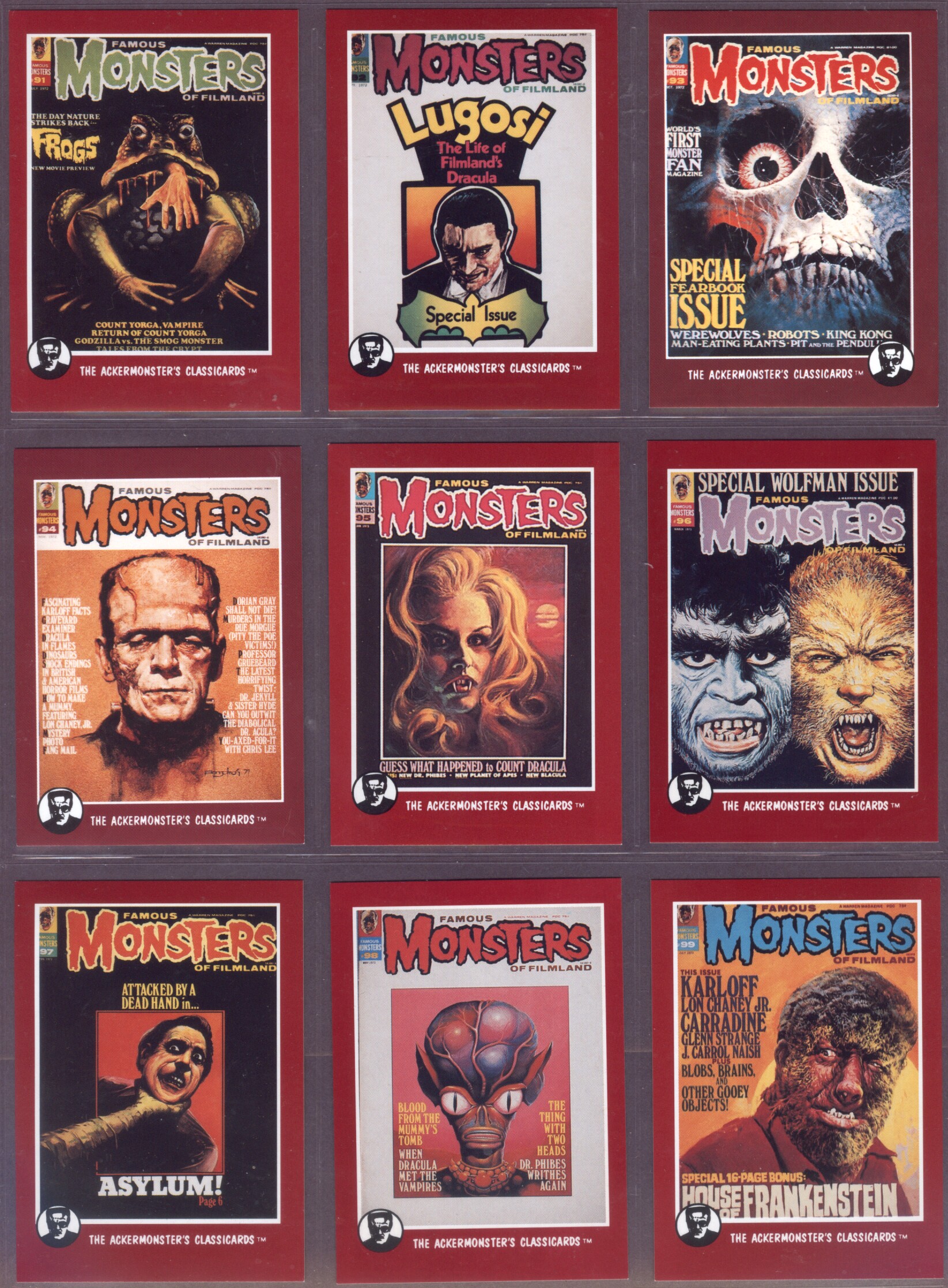 This set of 225 cards were issued in 5 different playing card type boxes. Each pack contained 45 cards in random order so you had to buy all 5 boxes to complete the set. Only sold at Famous Monsters of Filmland conventions, each card contained a picture of a cover of the FMofF magazine.