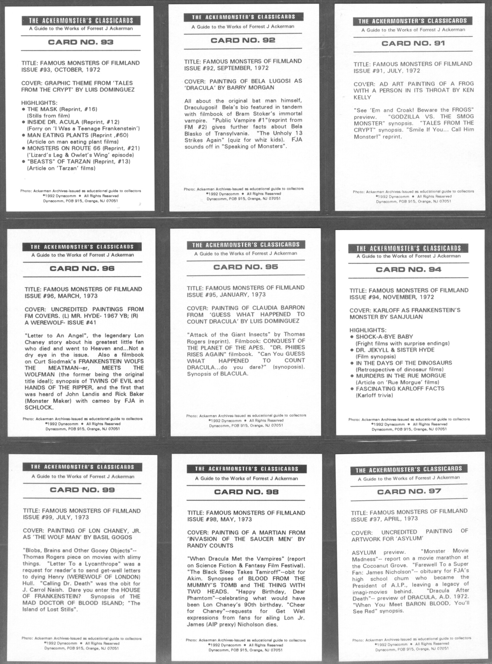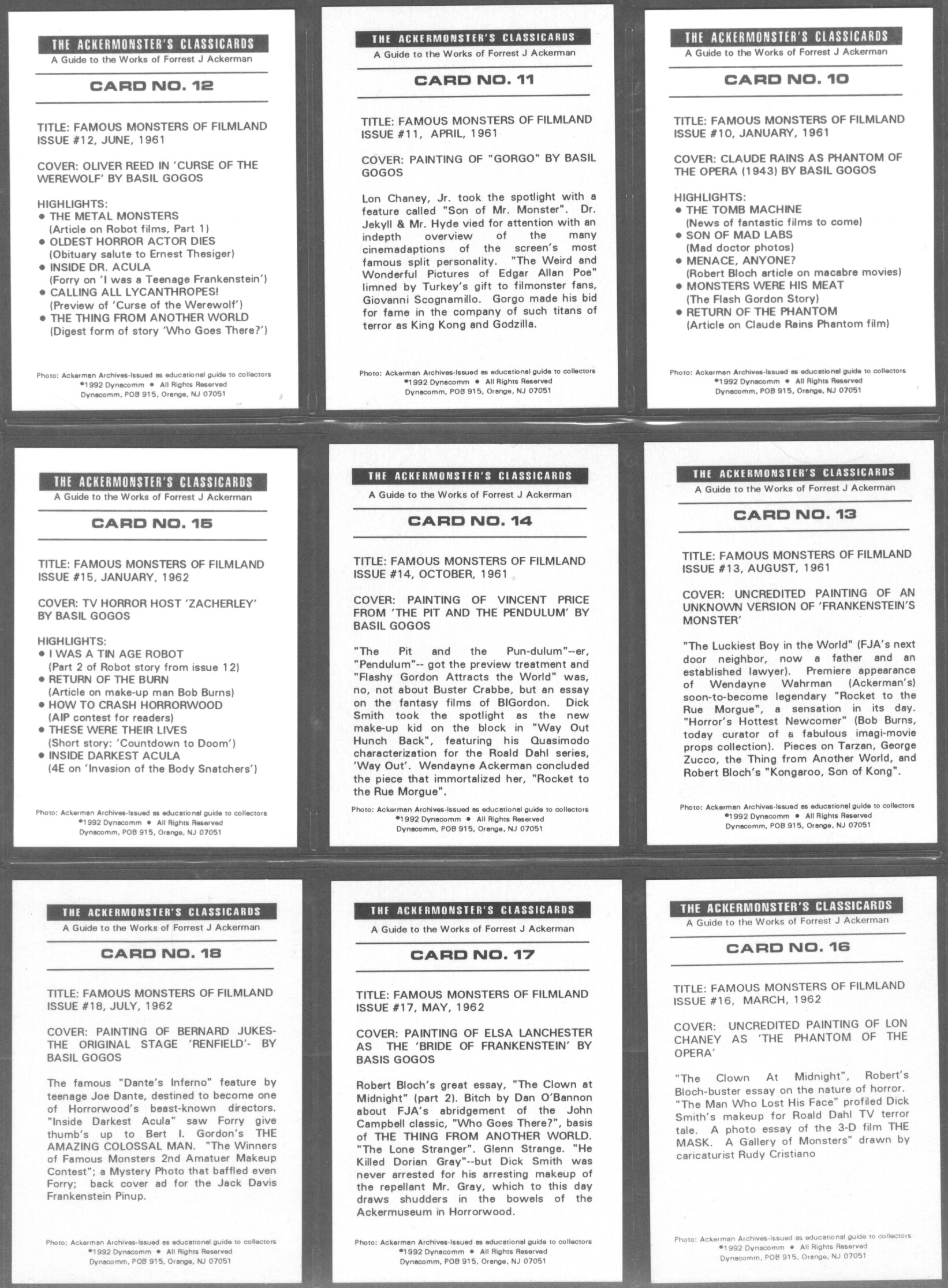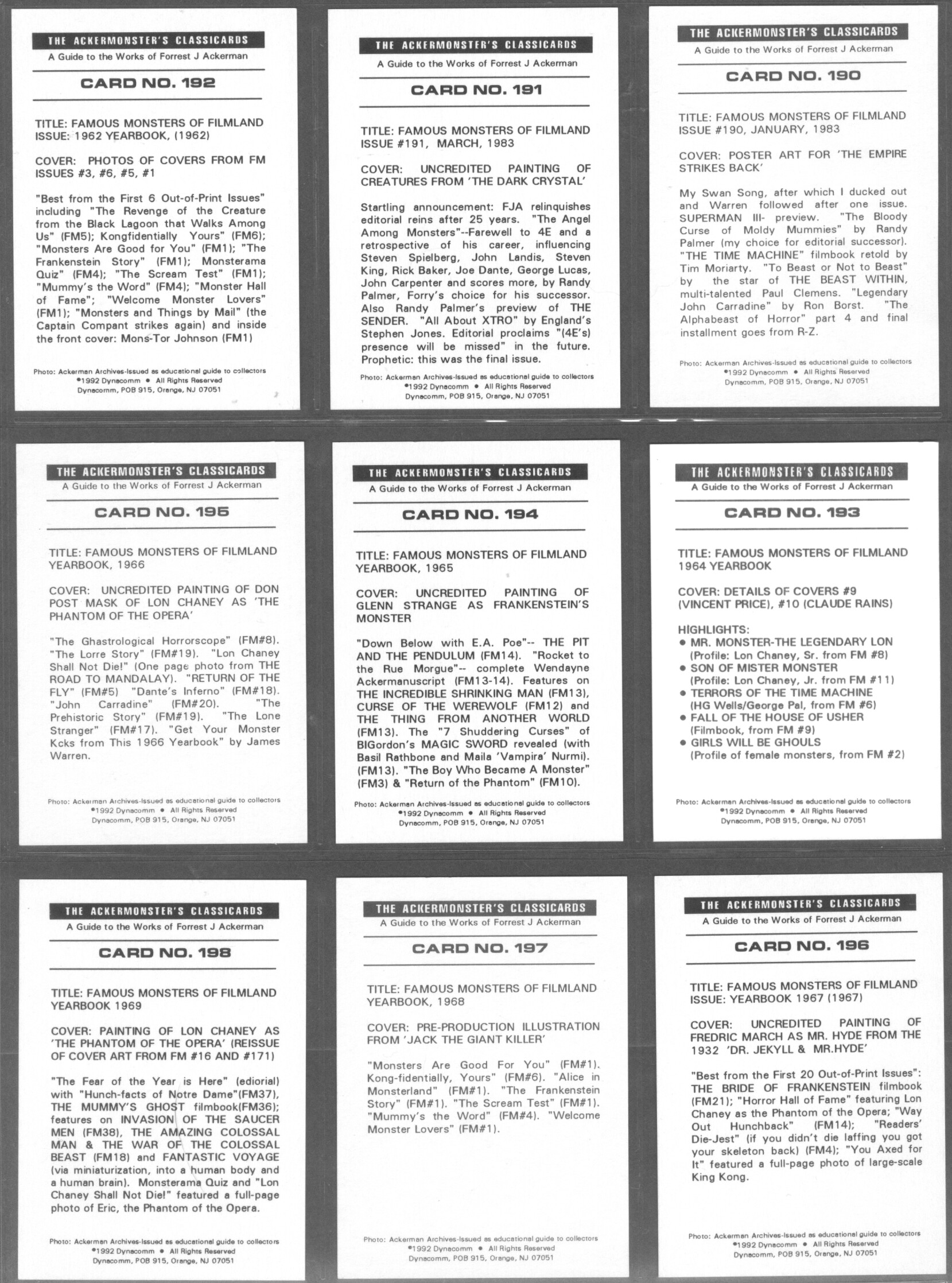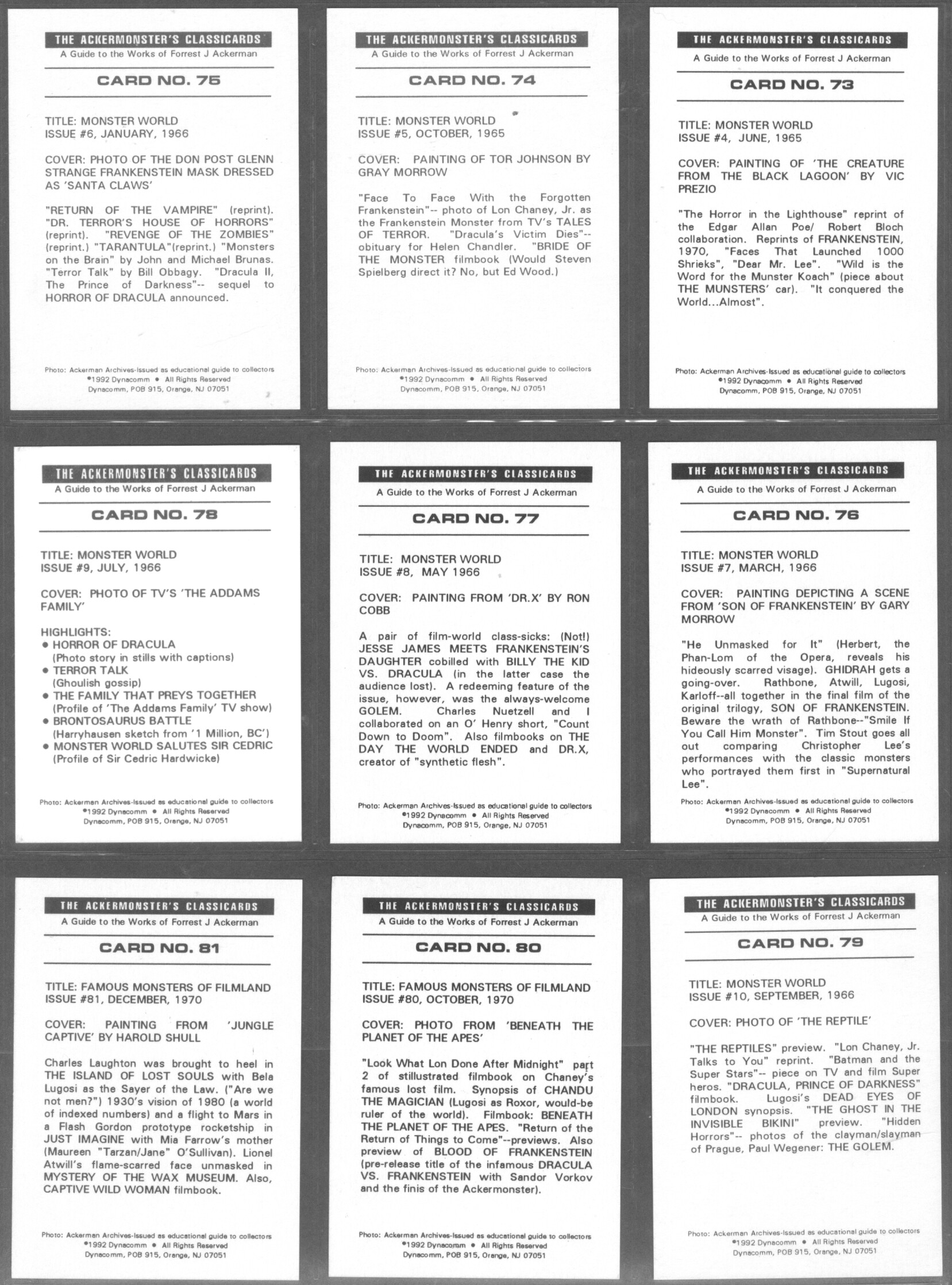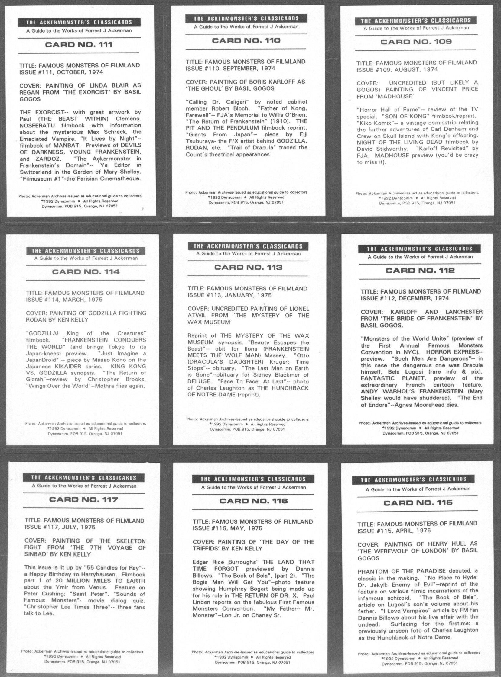 This set of 225 cards were issued in 5 different playing card type boxes. Each pack contained 45 cards in random order so you had to buy all 5 boxes to complete the set. Only sold at Famous Monsters of Filmland conventions, each card contained a picture of a cover of the FMofF magazine.