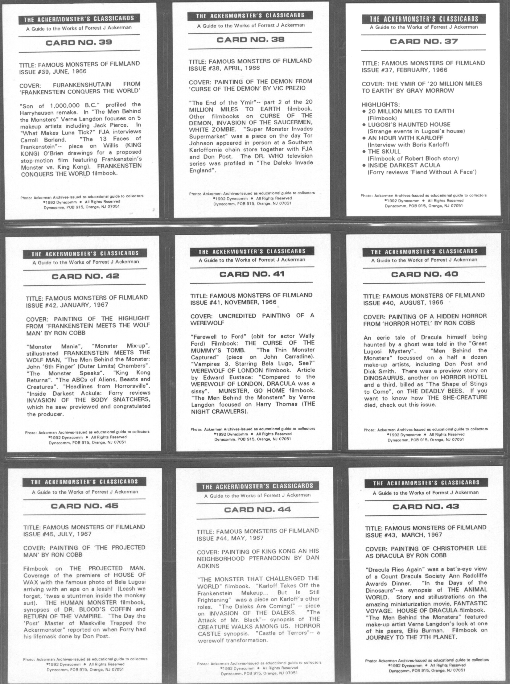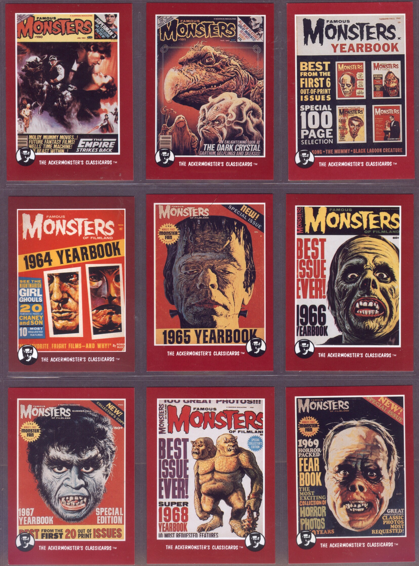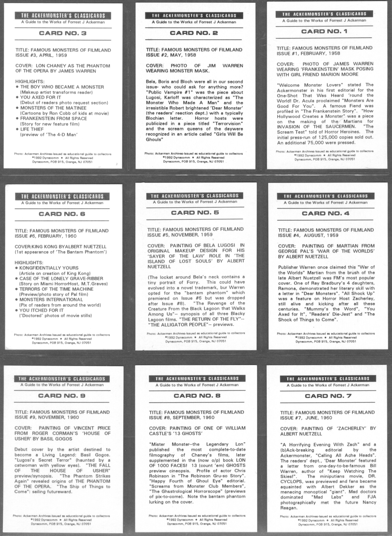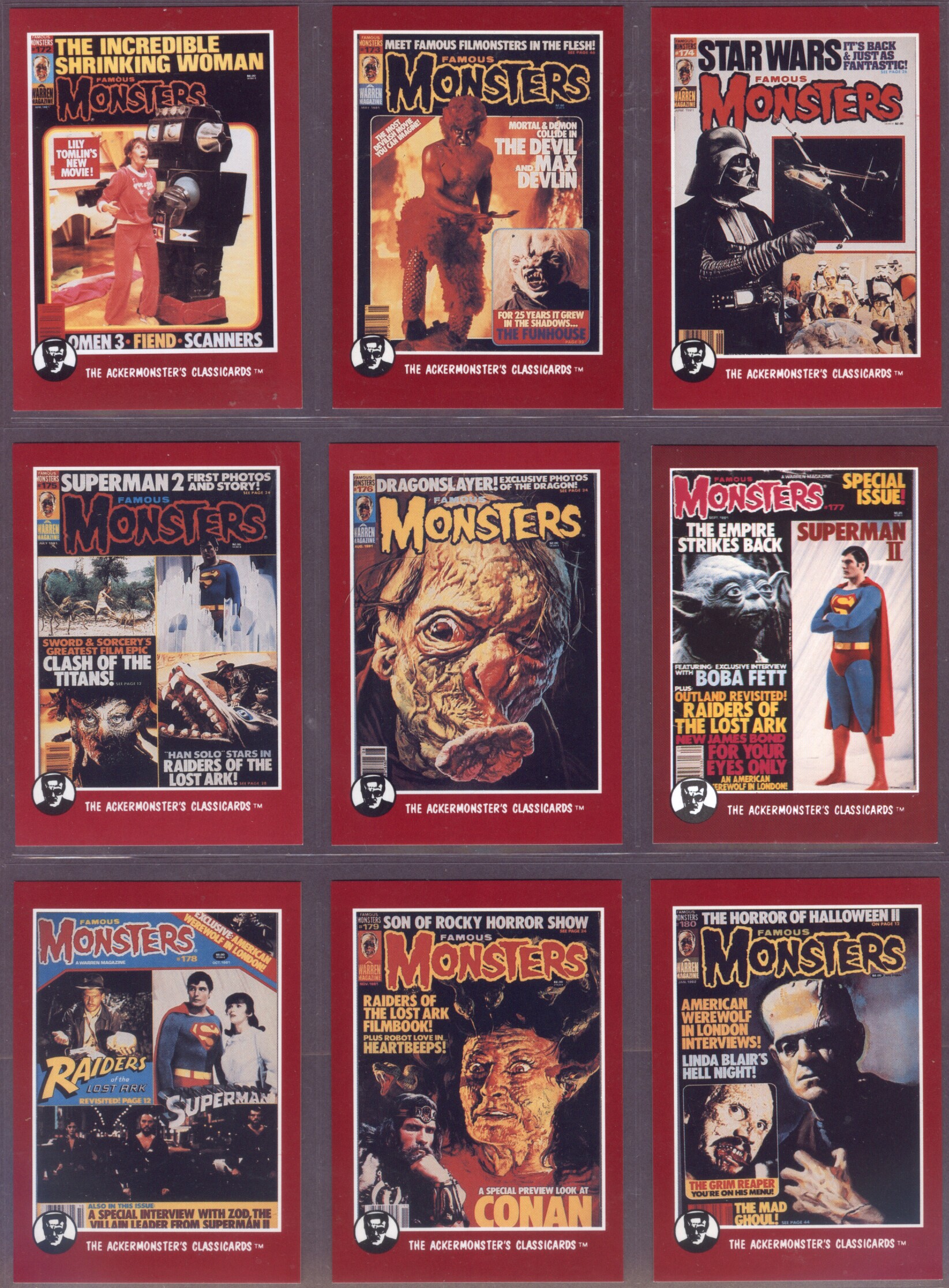 This set of 225 cards were issued in 5 different playing card type boxes. Each pack contained 45 cards in random order so you had to buy all 5 boxes to complete the set. Only sold at Famous Monsters of Filmland conventions, each card contained a picture of a cover of the FMofF magazine.