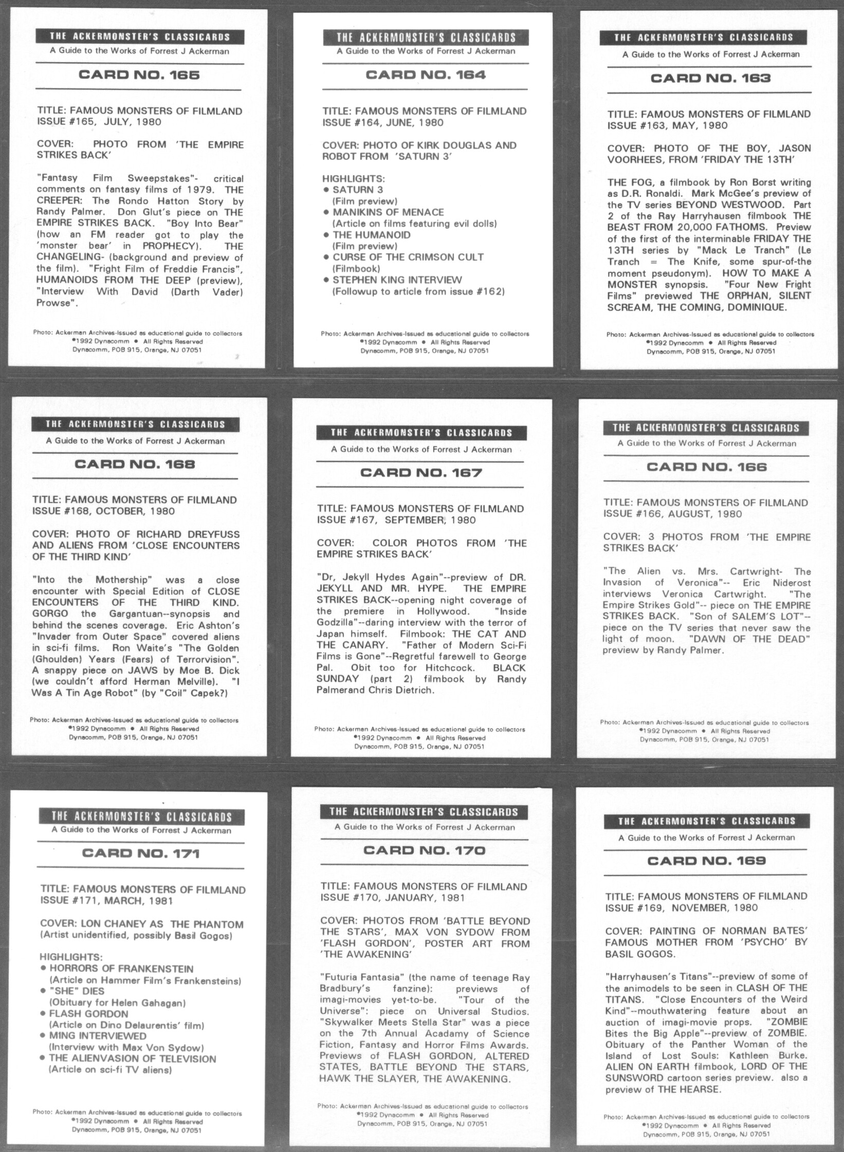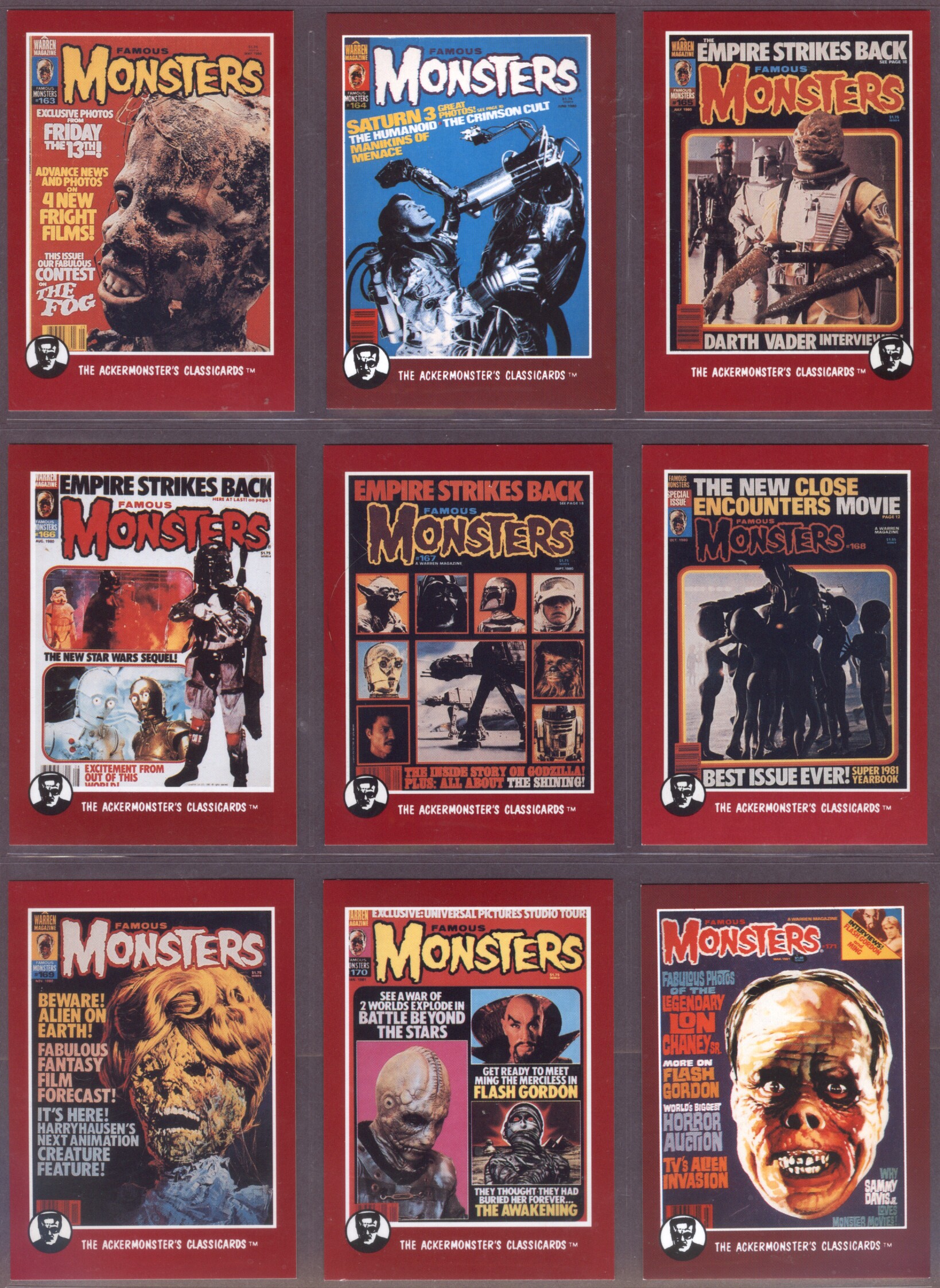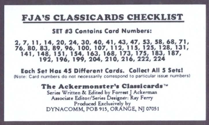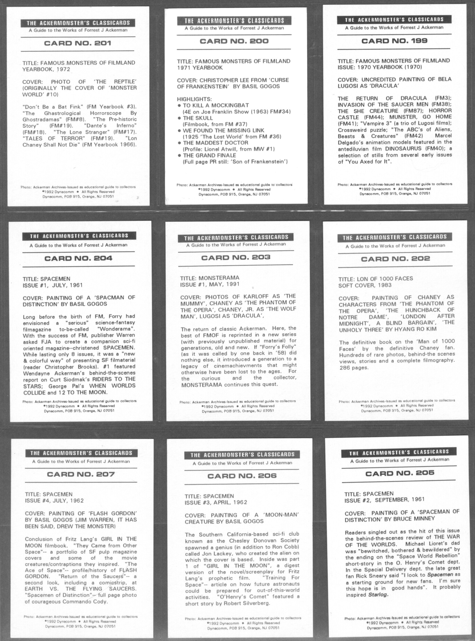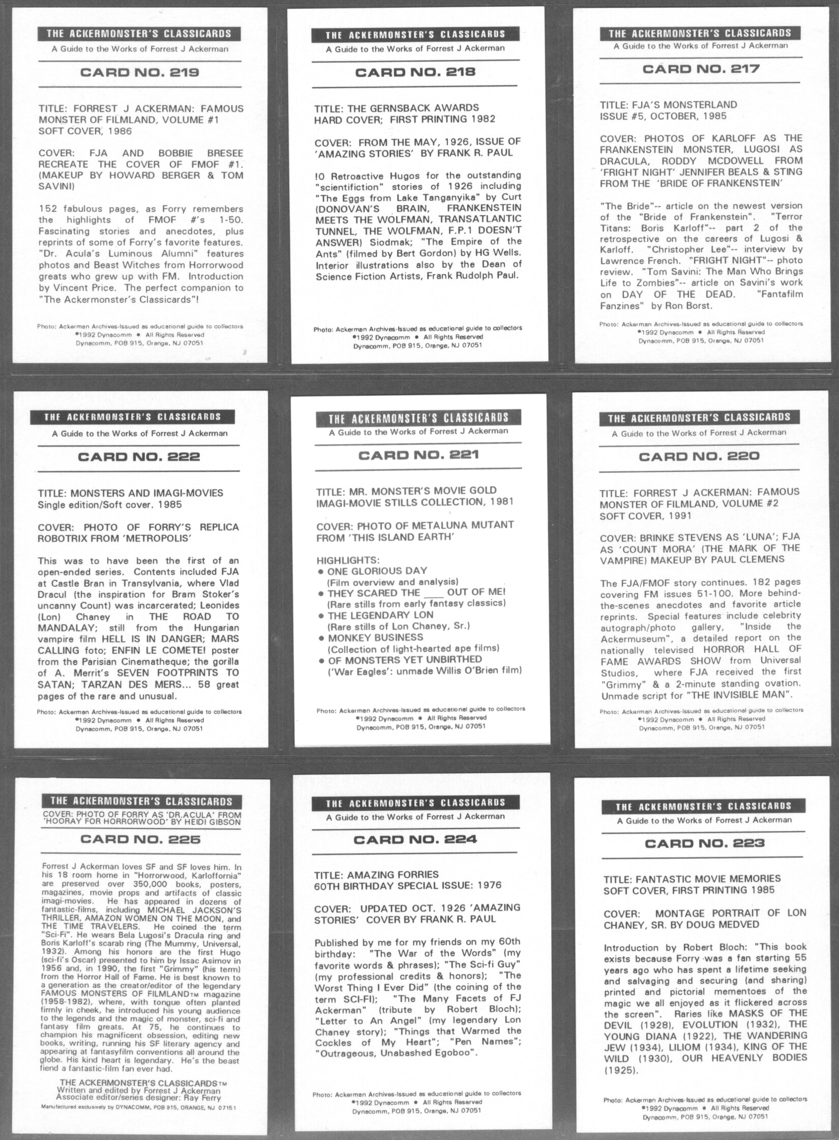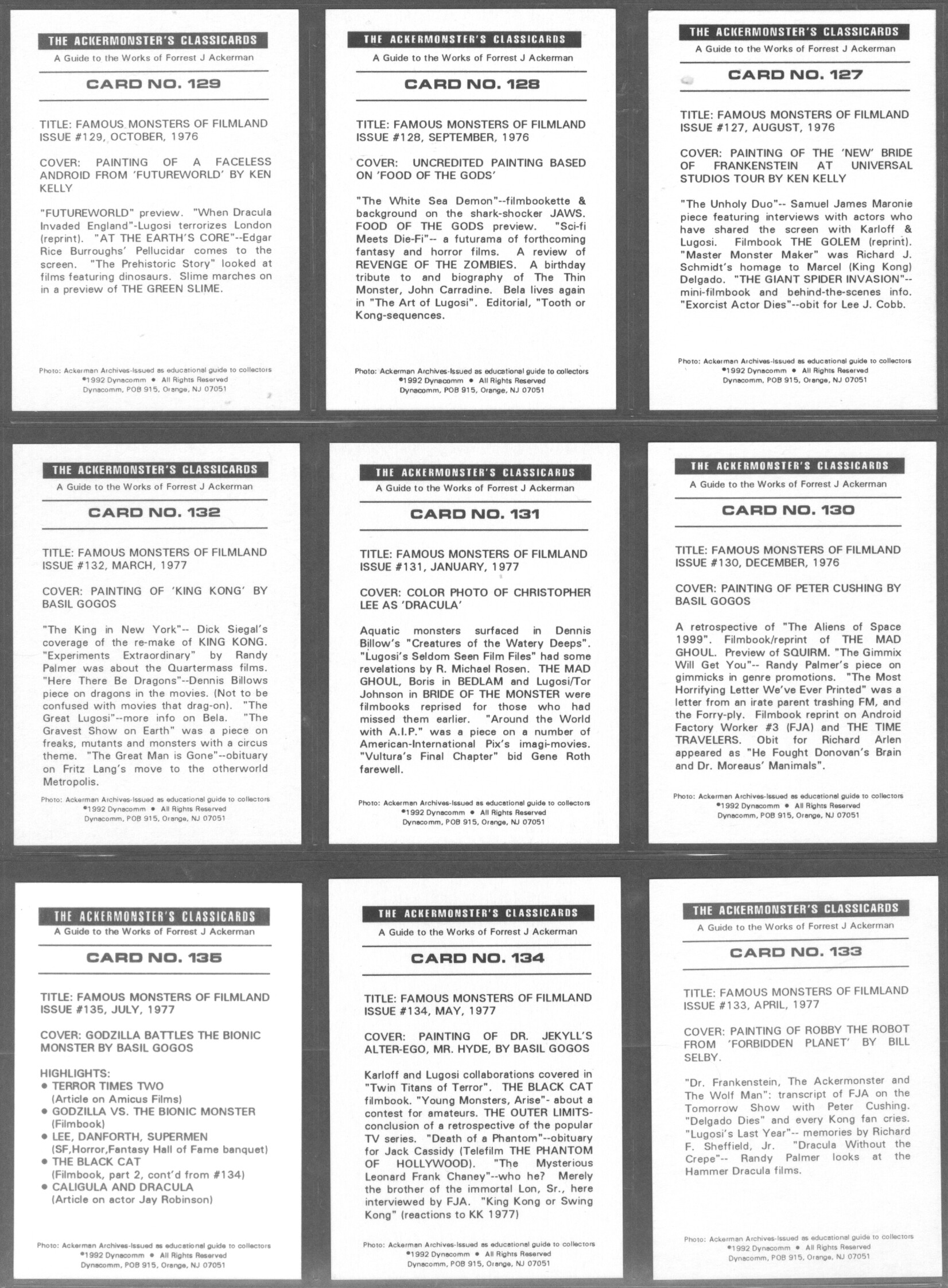 This set of 225 cards were issued in 5 different playing card type boxes. Each pack contained 45 cards in random order so you had to buy all 5 boxes to complete the set. Only sold at Famous Monsters of Filmland conventions, each card contained a picture of a cover of the FMofF magazine.