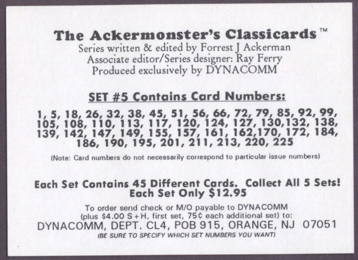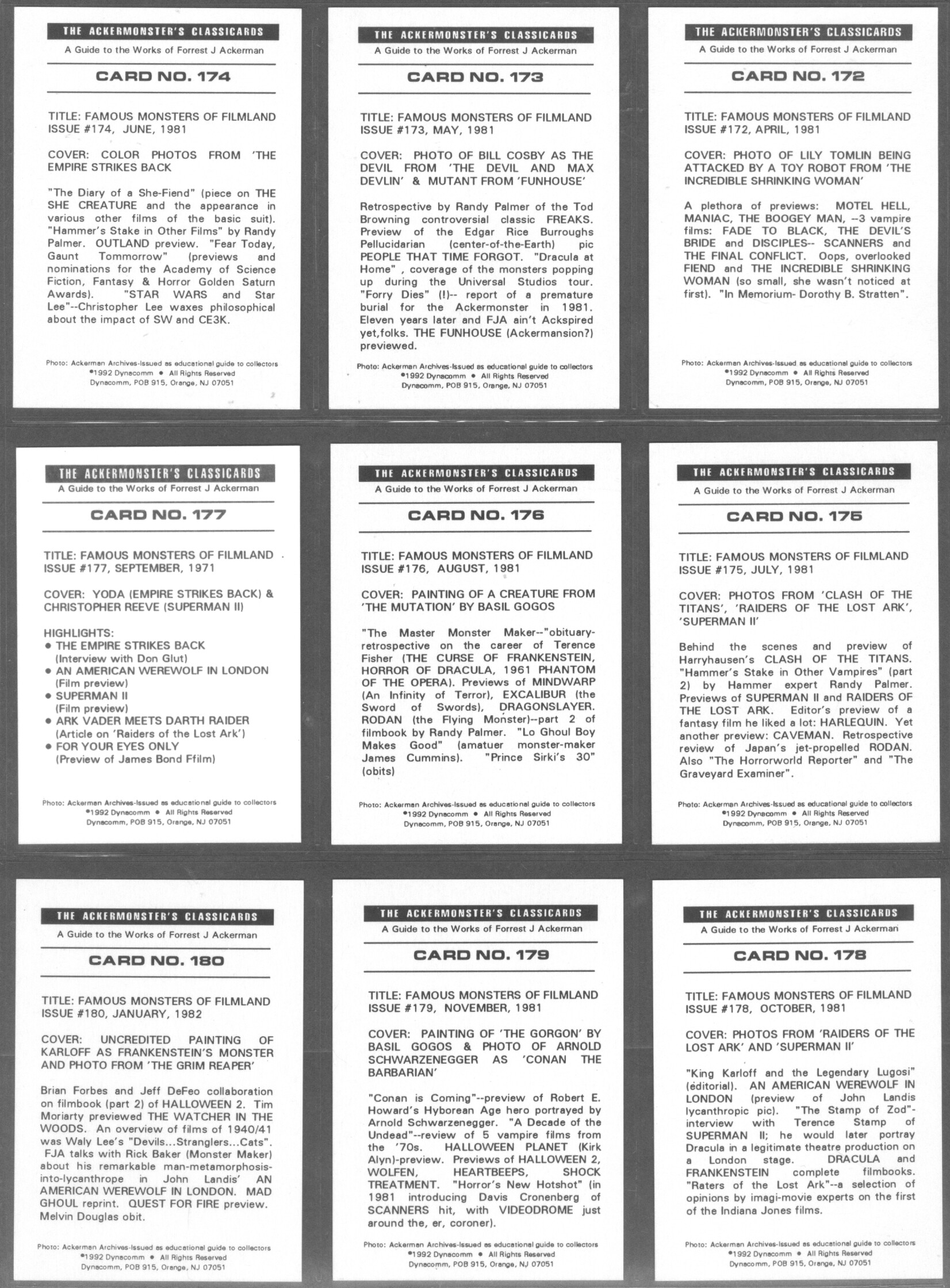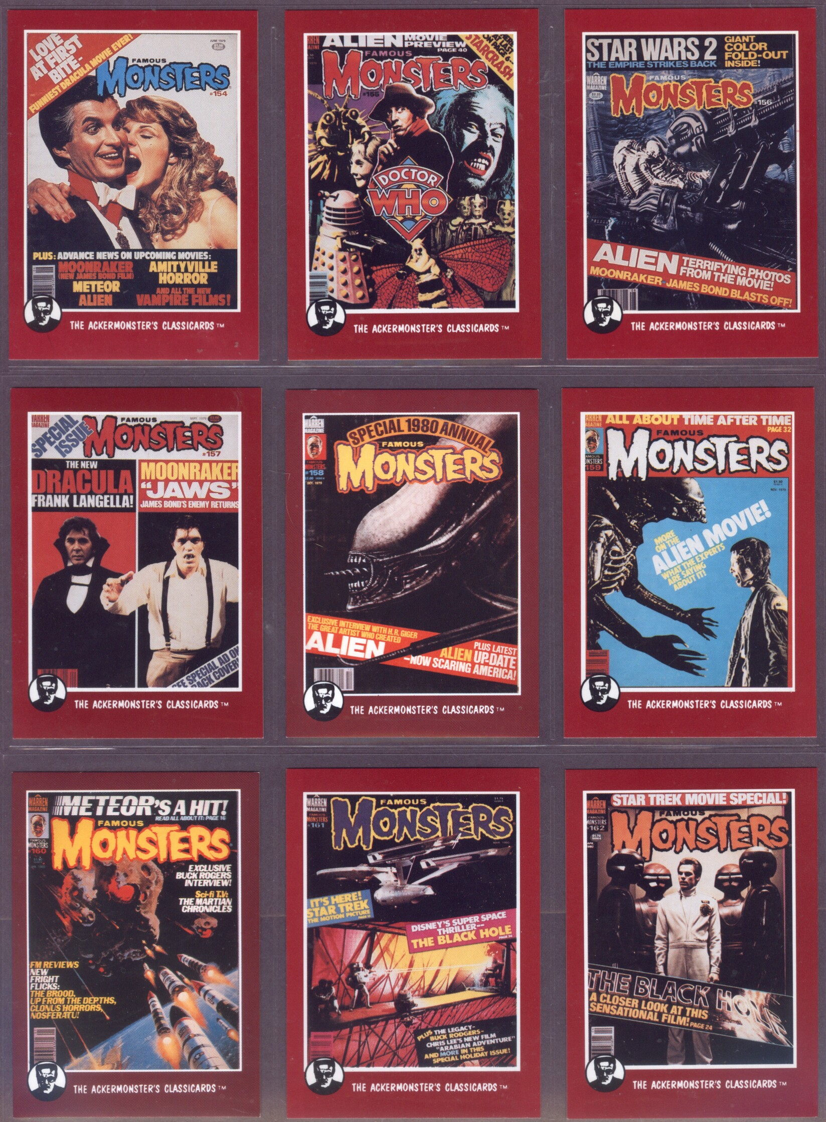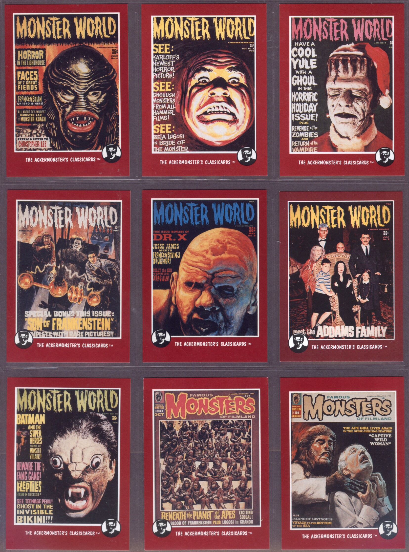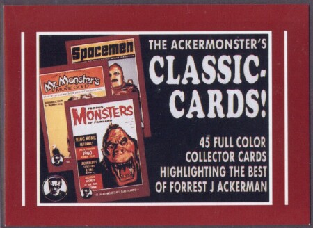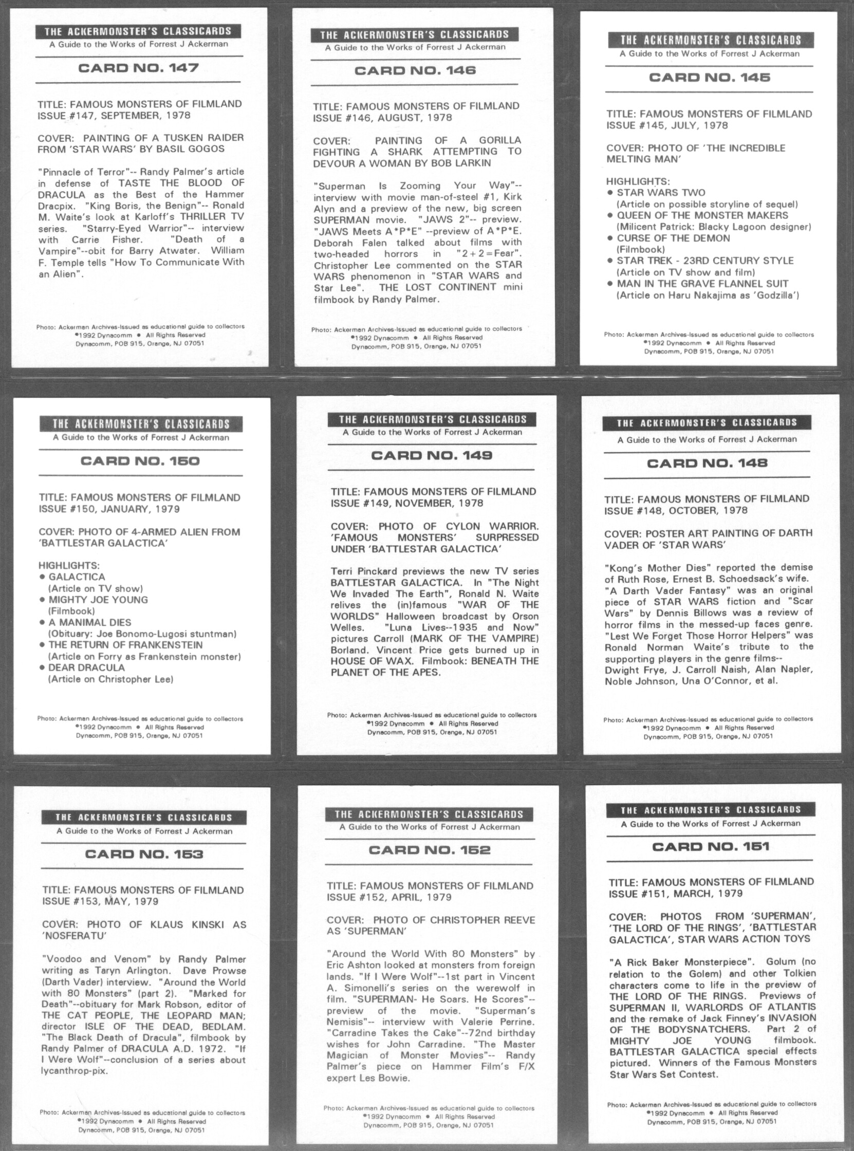 This set of 225 cards were issued in 5 different playing card type boxes. Each pack contained 45 cards in random order so you had to buy all 5 boxes to complete the set. Only sold at Famous Monsters of Filmland conventions, each card contained a picture of a cover of the FMofF magazine.