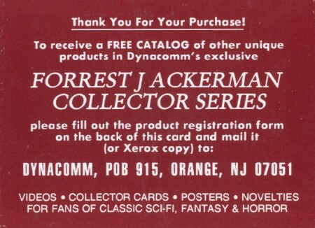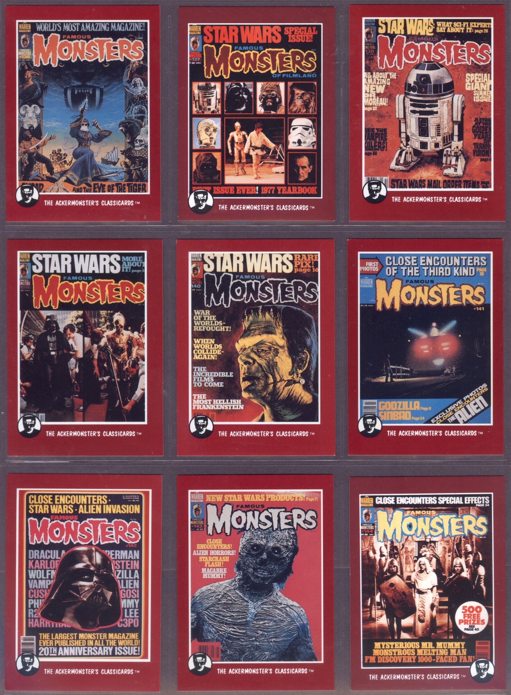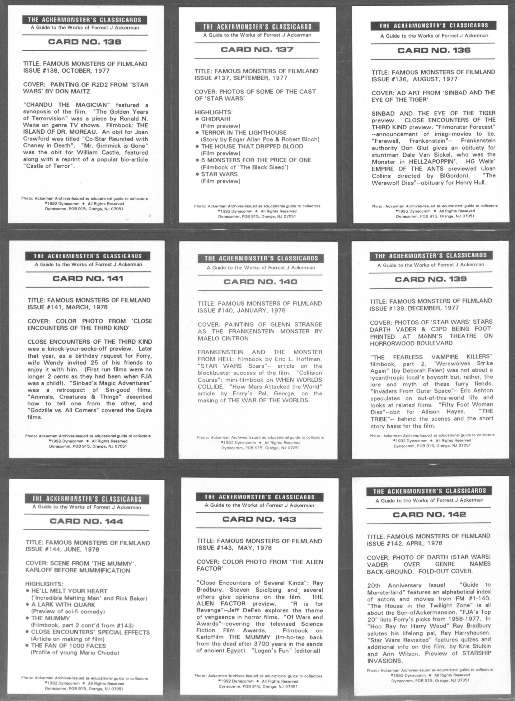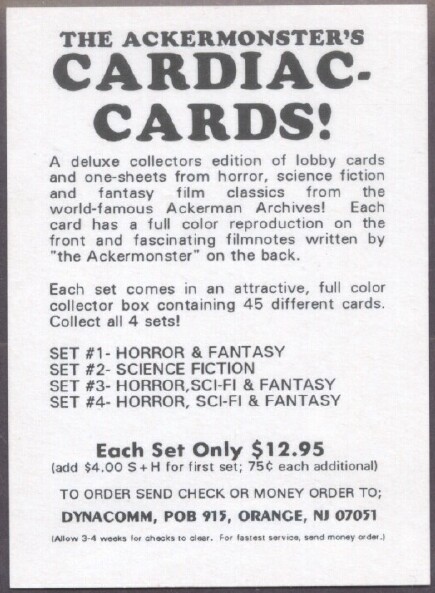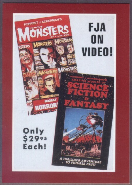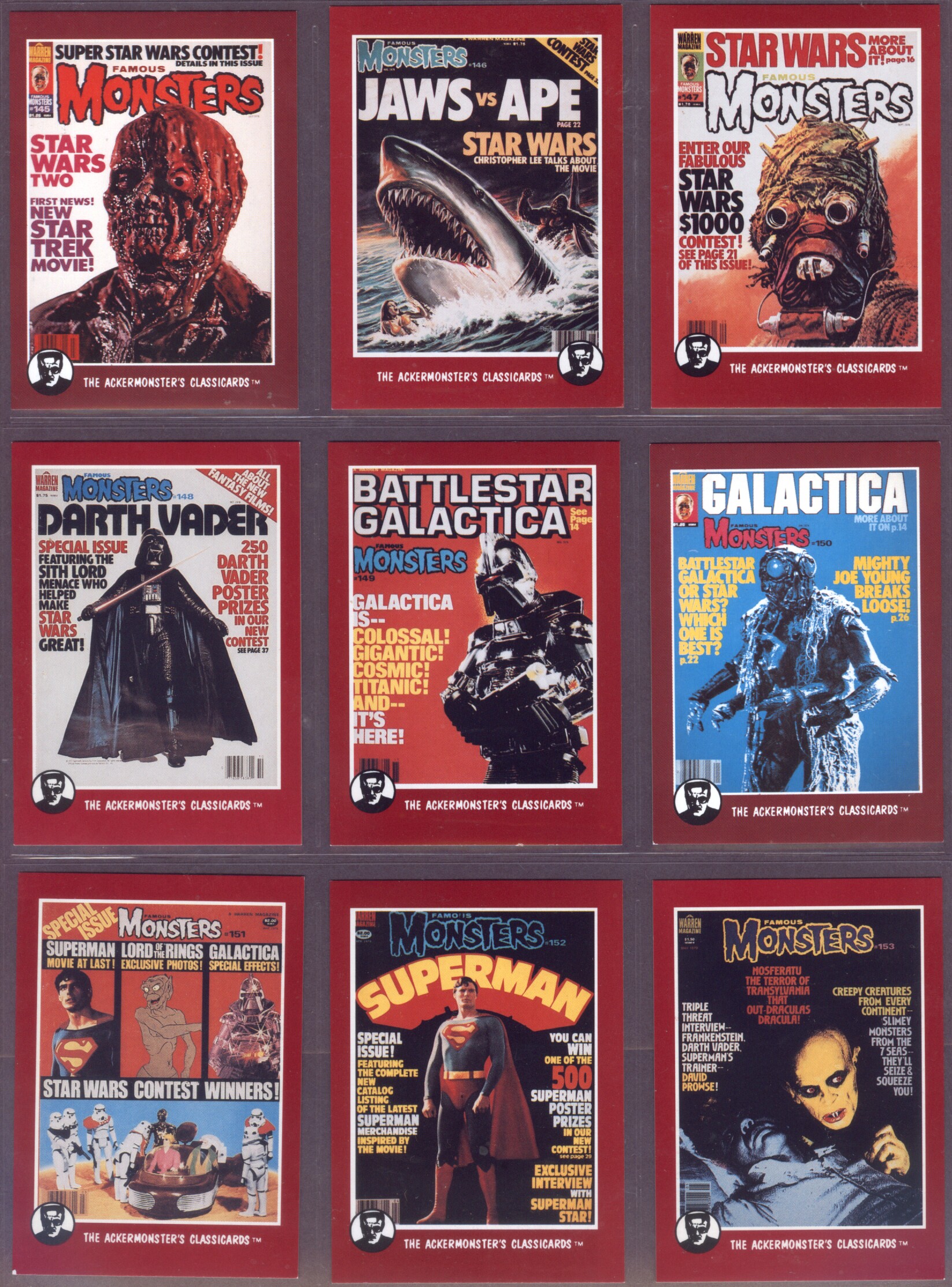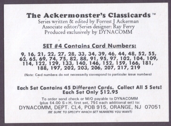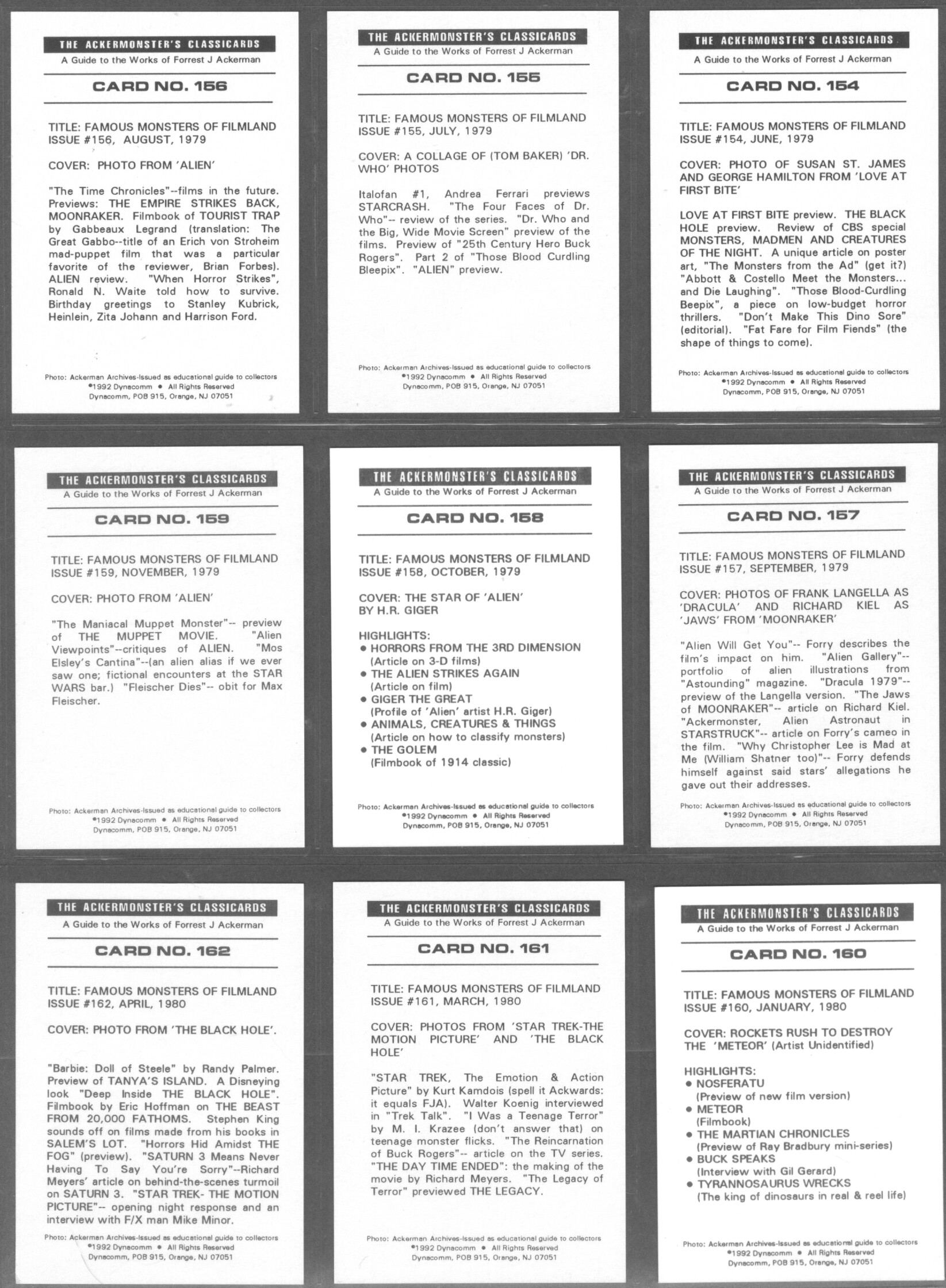 This set of 225 cards were issued in 5 different playing card type boxes. Each pack contained 45 cards in random order so you had to buy all 5 boxes to complete the set. Only sold at Famous Monsters of Filmland conventions, each card contained a picture of a cover of the FMofF magazine.