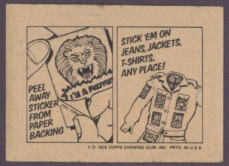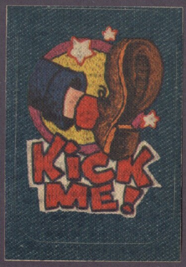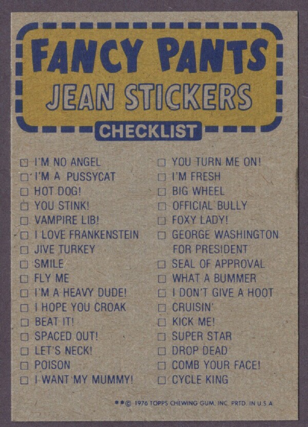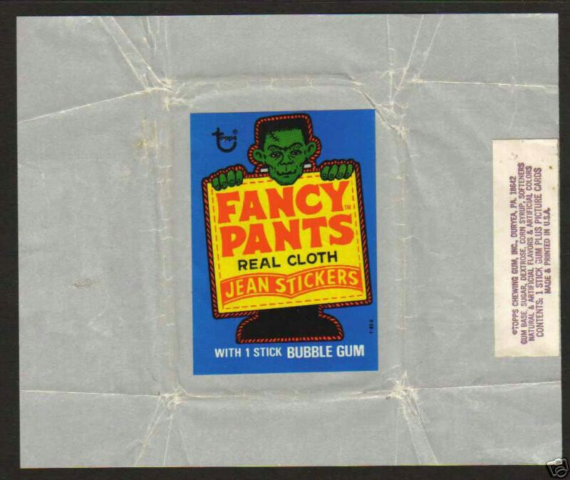 These are some images of the test set of Topps Fancy Pants stickers. The set was made in 1976 and test marketed in Brooklyn, NY by Topps Chewing Gum. Not much is known about the set other than they weren't received well and thus not manufactured for national disctribution. The stickers themselves are very fragile as they were made with a fabric type material. Just like the wacky packages cloth sticker set, this poses a problem for collectors who want to keep them for posterity as they tend to lose their adherence to the back of the card and slide. It's probably best to keep them in penny sleeves and inside top loaders. As with any cloth type card set never put them in nine card sleeves.