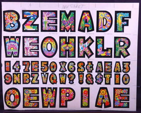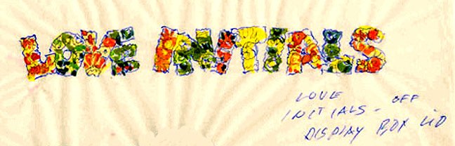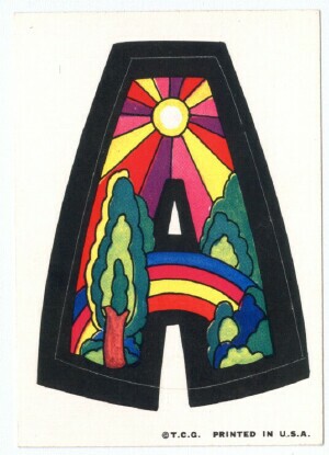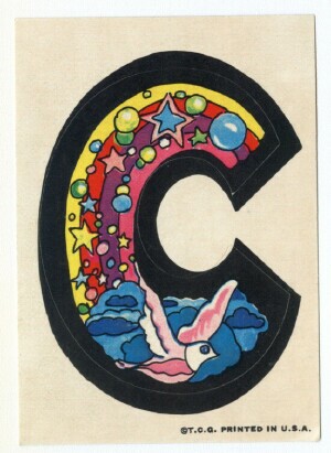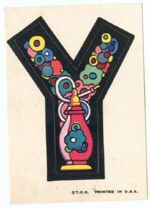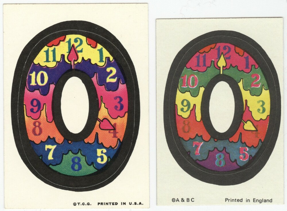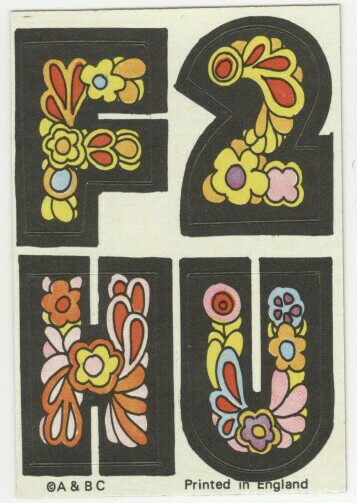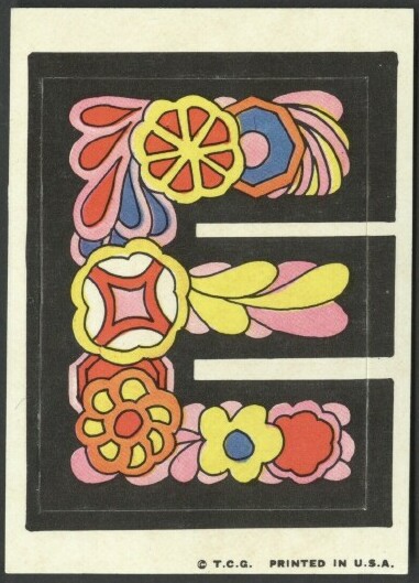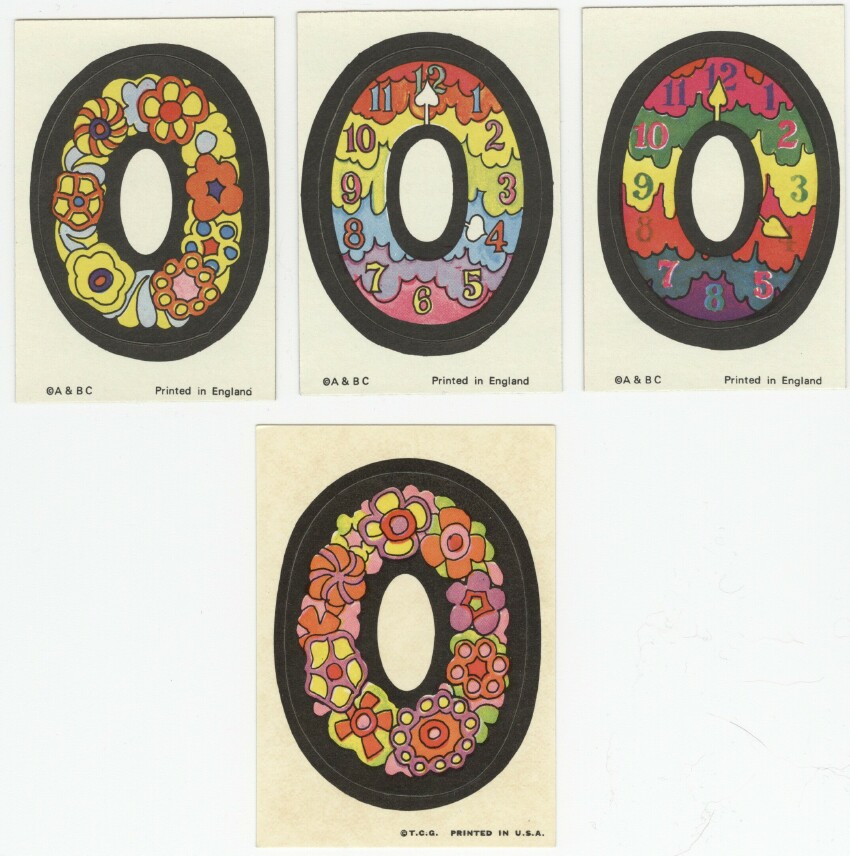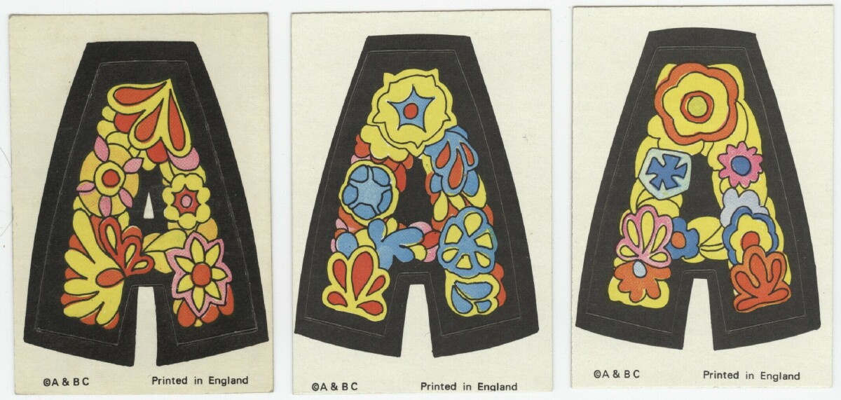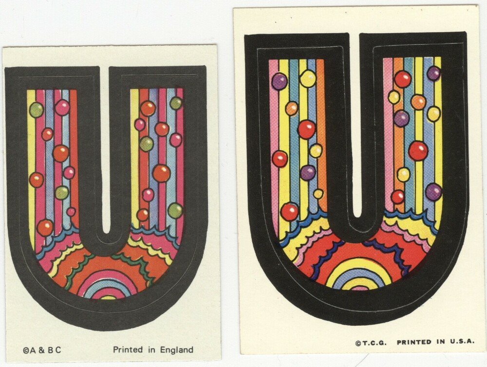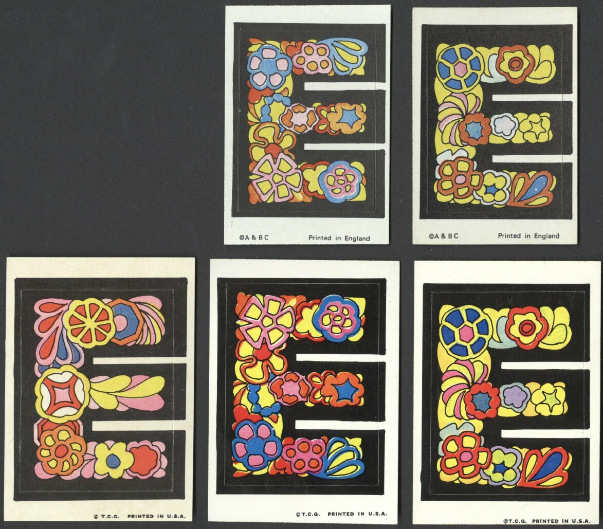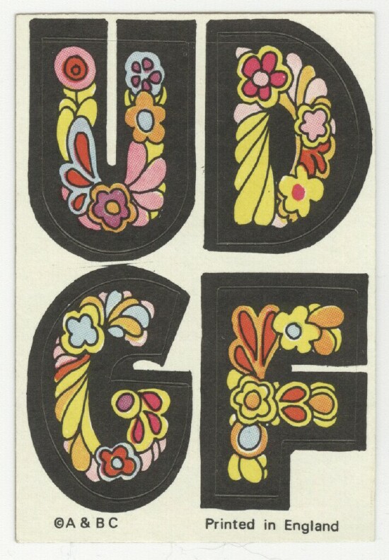 A&BC LOVE INITIALS, UK version (1970) 84 Tan back peel-off stickers, cards smaller than US version) Wrapper Some UK initials were inverted versions of the US cards. ZN & X were turned upside down while at least two letters, E was inverted. Several US initials were NOT yet discovered to be included in the UK set: A (rainbow var) & E (flower var), C (bird var) & Y (urn var)...while at least two cards did not appear in the US set: F2HU & UDGF. In addition, the Rare Yellow Hands '8 o'clock' Letter O Sticker appeared in this set as well as L and U with noticable color differences.