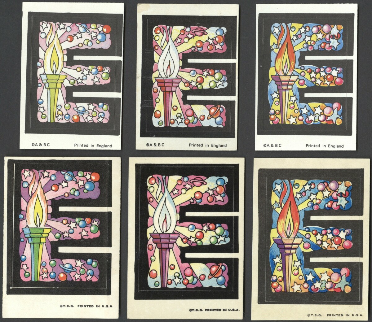 Here you can see the O letters with the US card which is inverted in the a&bc set (Scan needed). Also, comparisons of the US/UK E flowers & E torches together as well as the A flowers.