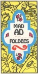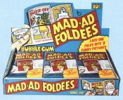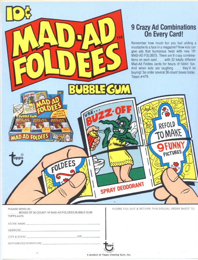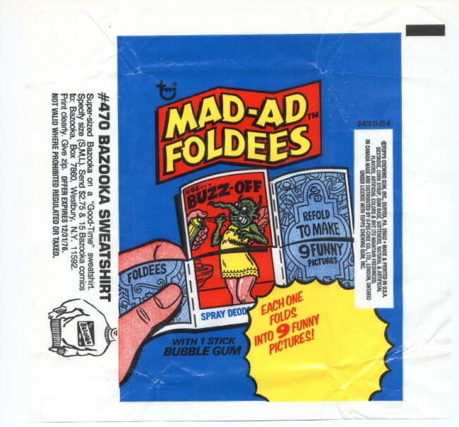 Topps Mad Ad Foldees- made in 1975, were post card size with perforations horizontally in the middle on both sides with two folds vertically in thirds. Once you popped the perferations, you could make 9 different funny pictures. Wrapper serial # 0-479-21-01-6 |