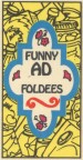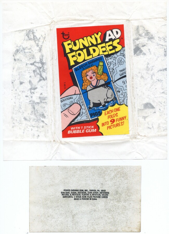 Topps Funny Ad Foldees- Test set for Mad Ad Foldees. Issued with 'Funny Ad' printed on card instead of 'Mad Ad'. Here you see the original sell sheet & Wrapper Notice that the large sticker that sealed the wrapper and silver glue it left behind. Many images painted by Norm Saunders.