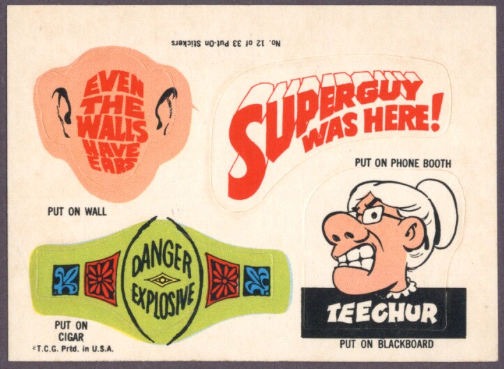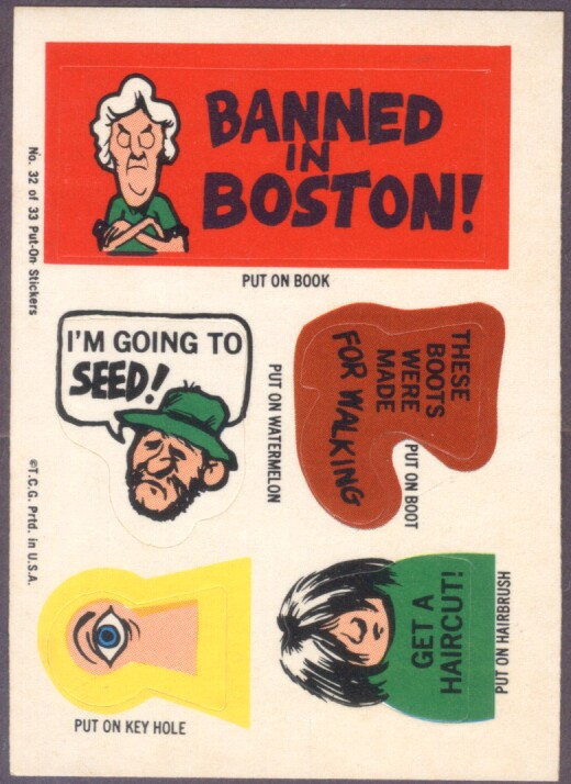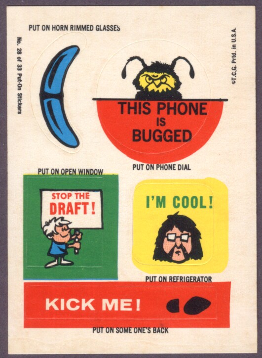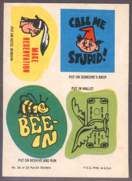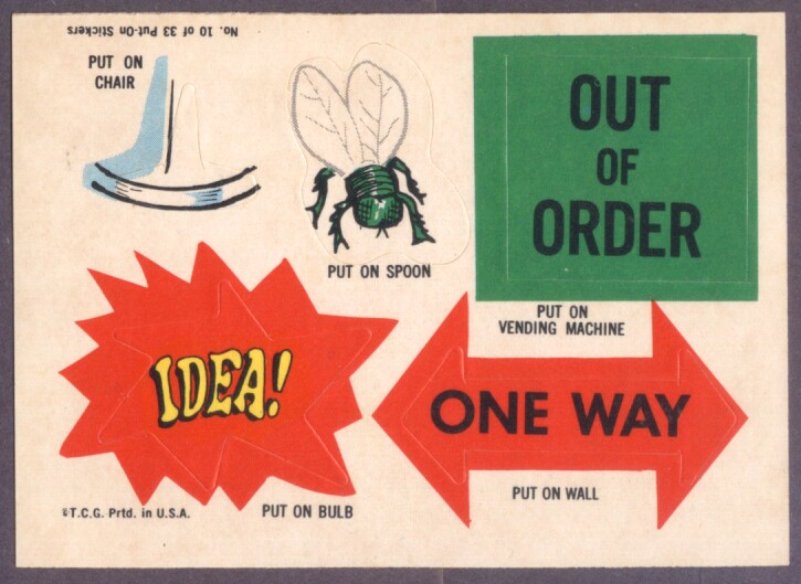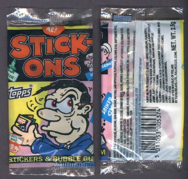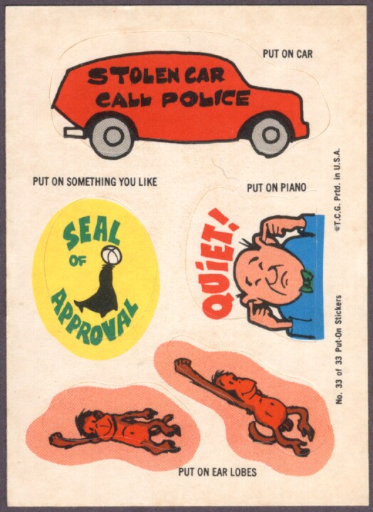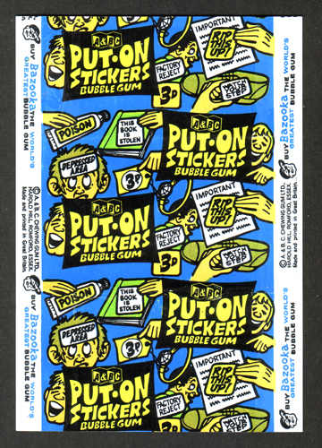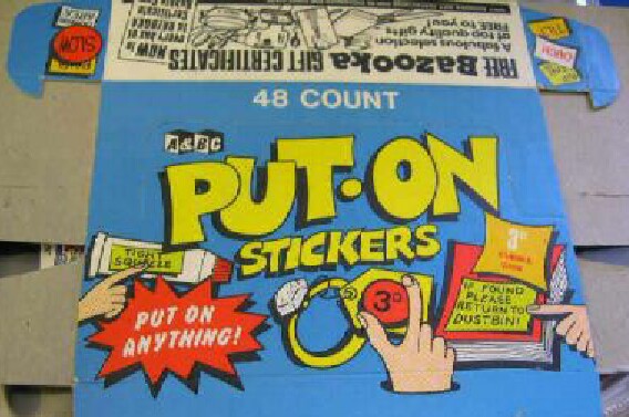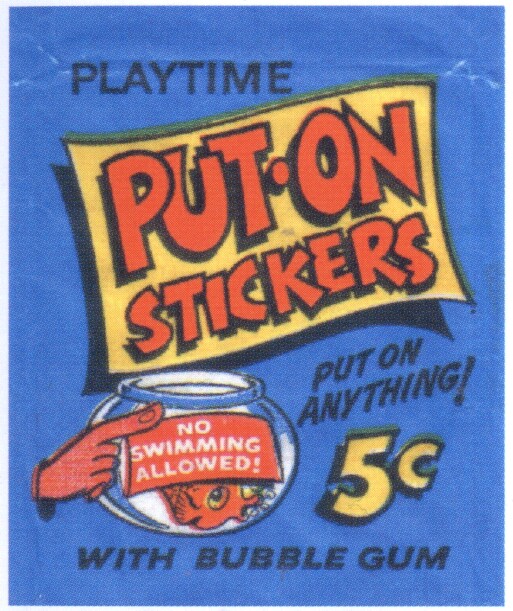 Put-On Stickers were made in 1968 by Topps first as a Test set then a regular issue. They were also released in England by A&BC, in New Zealand by Playtime, reissued in 1981 by Topps Ireland and once again in Ireland as Stick-Ons in 1988.